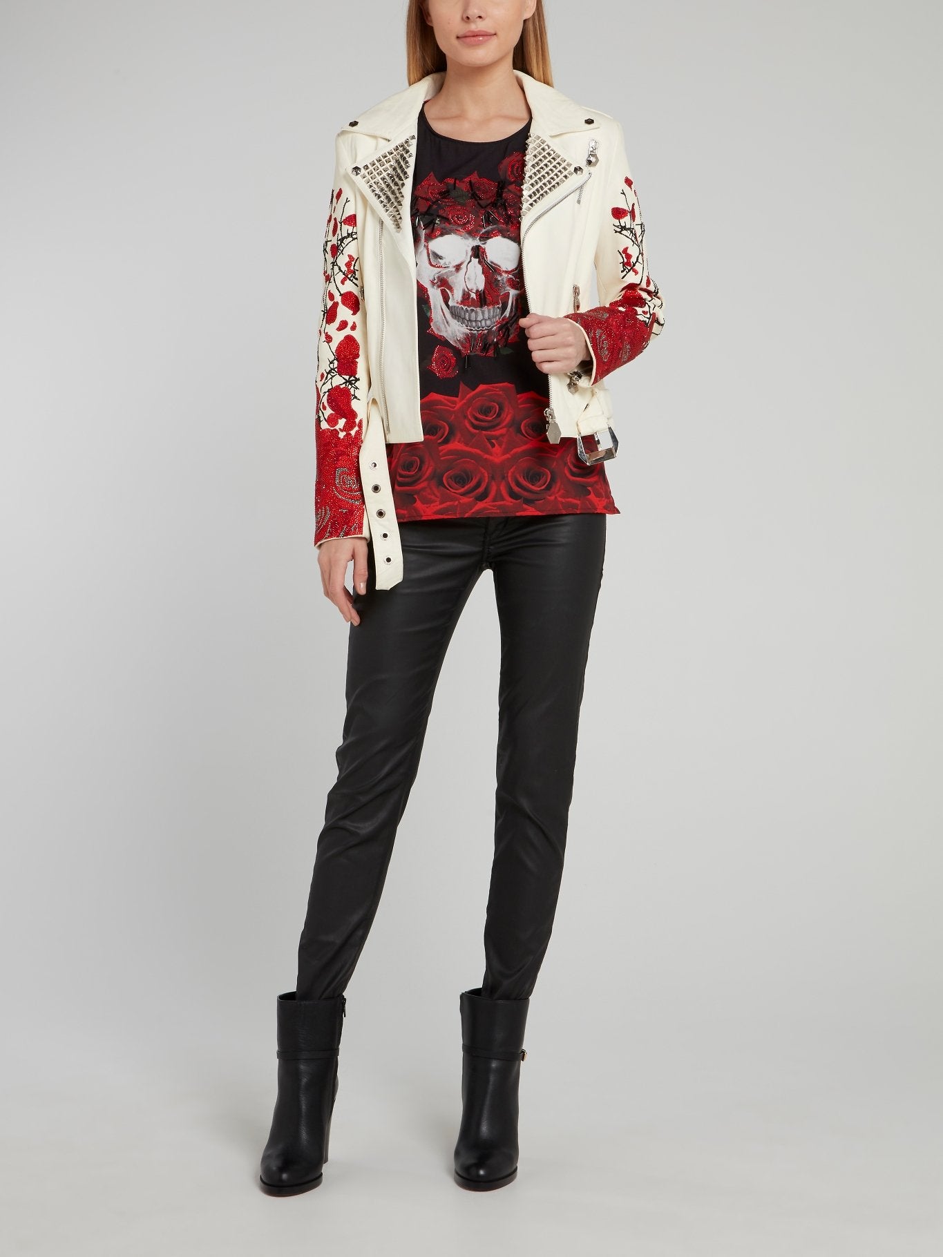The Studded Rose Skull Tank Top from Philipp Plein is a fierce and fashionable addition to any wardrobe. Featuring an intricate and eye-catching skull design embellished with shimmering studs, this tank top is sure to turn heads. Perfect for edgy and bold fashionistas looking for an unforgettable statement piece.