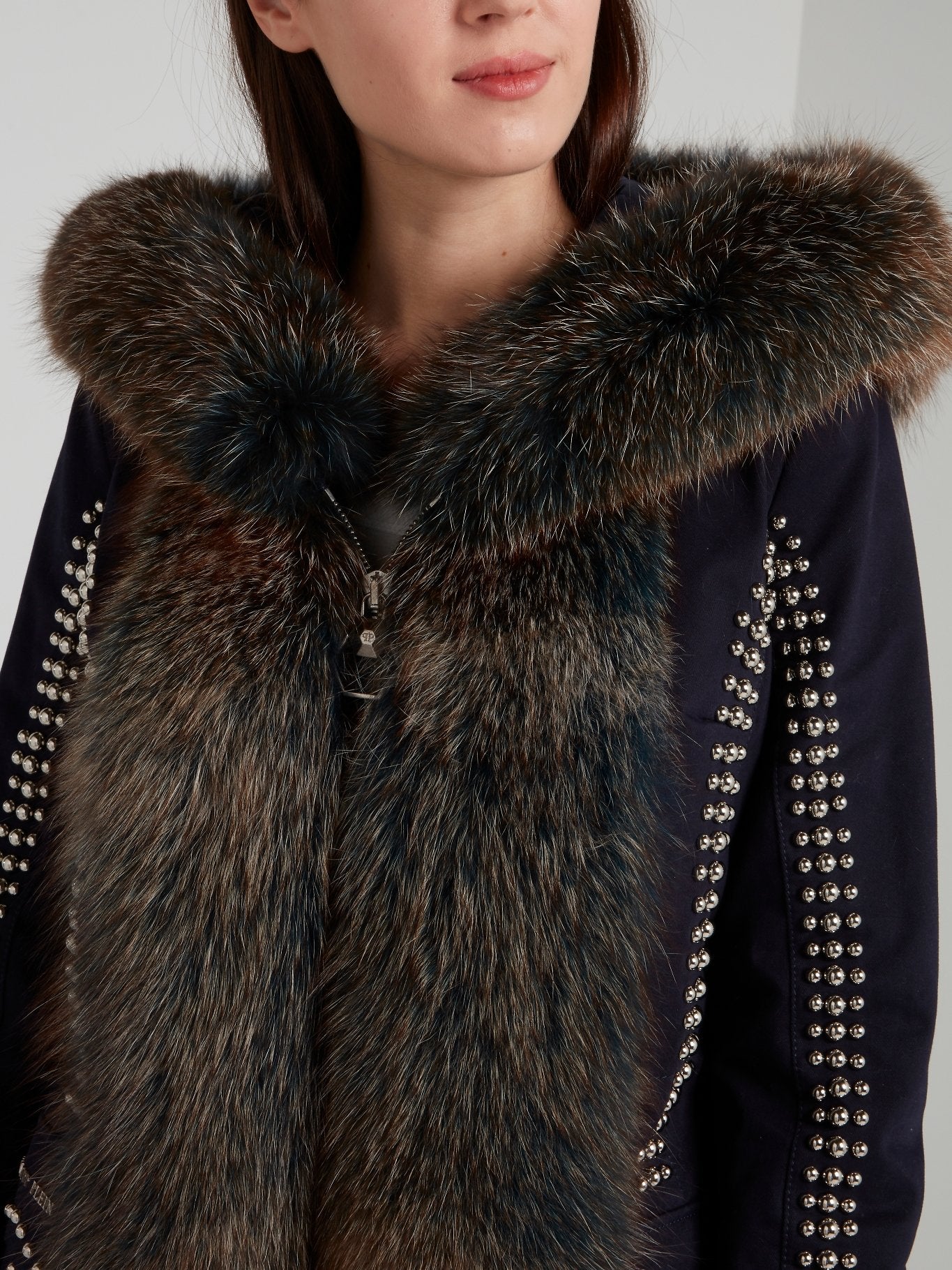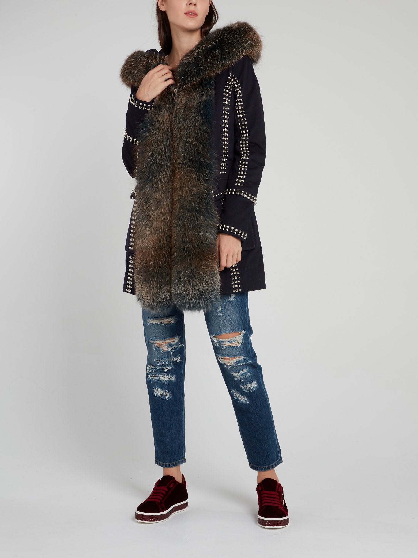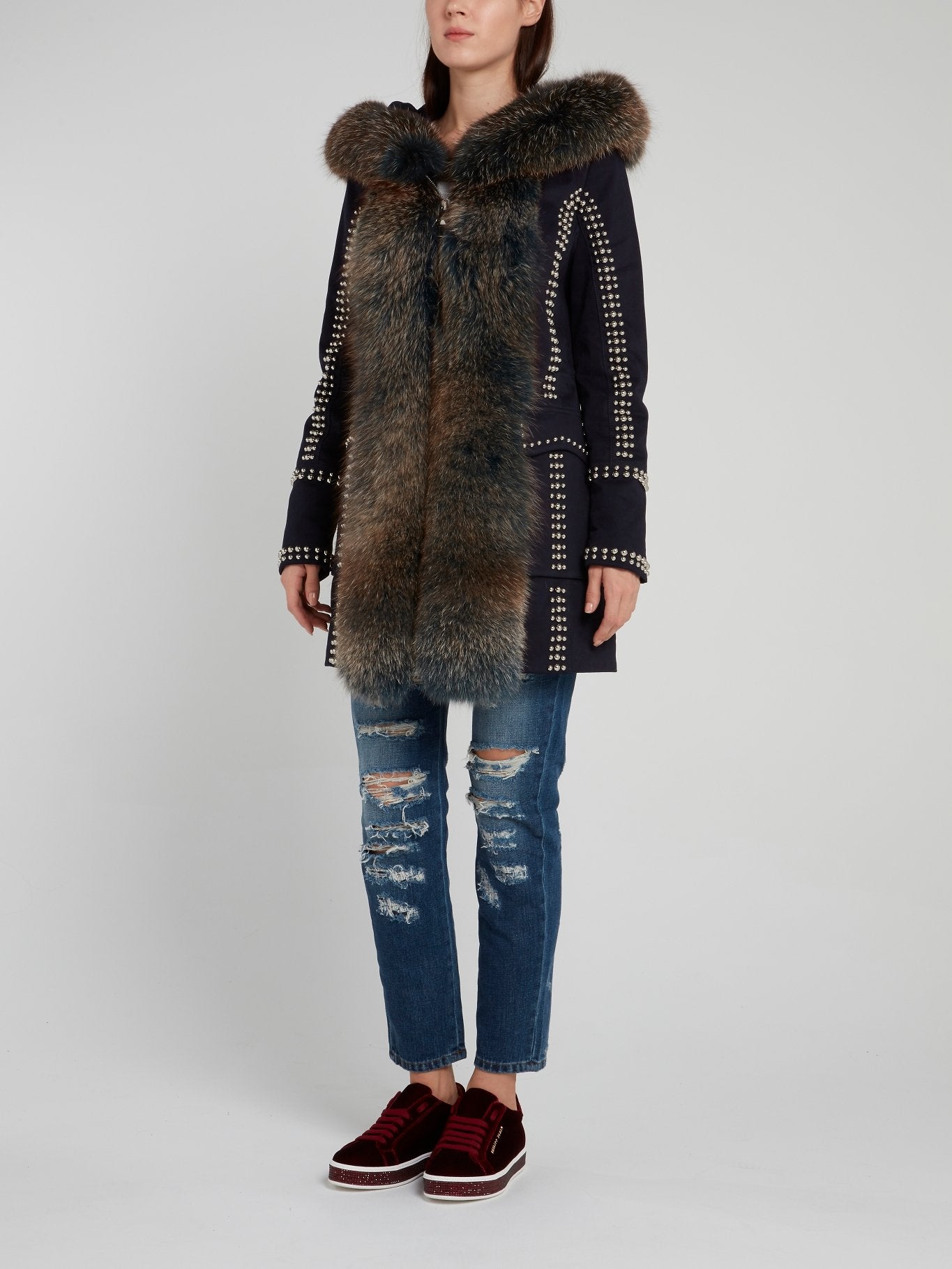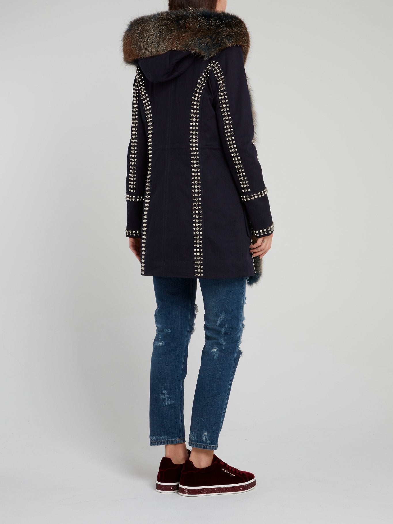 The Navy Fur Panel Studded Parka by Philipp Plein is a blend of style and comfort. The stunning studded detailing transforms it from a simple coat to a fashion statement while the fur-lined hood offers a cozy feel. With its rich navy color, it's the perfect addition to any cold-weather wardrobe.