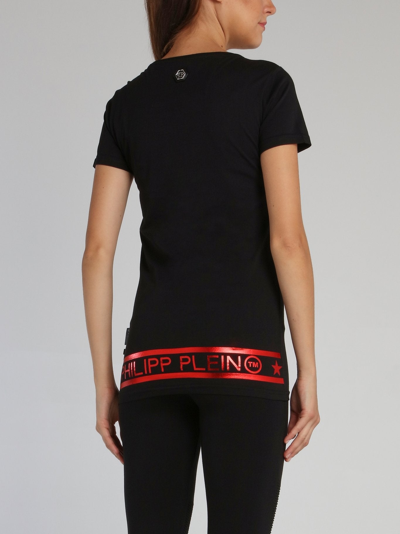 Unleash your edgy side with the Black Crystal Skull Crewneck T-Shirt by Philipp Plein. This statement piece features a sleek black fabric adorned with a mesmerizing crystal skull graphic embellished with Swarovski crystals. The unique design adds some rockstar glam to your wardrobe and will make you stand out from the crowd.