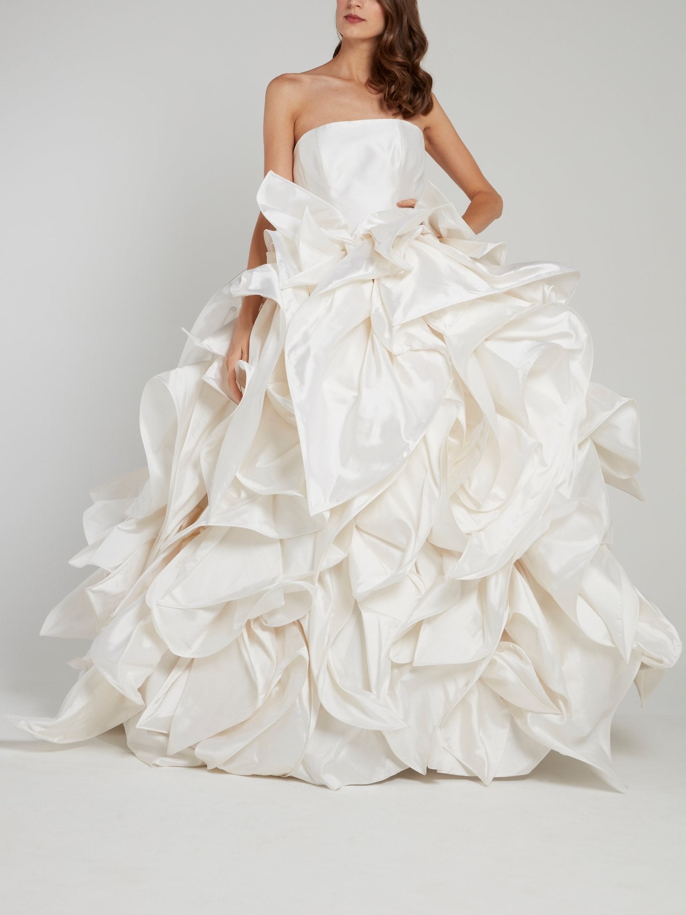 This gown is a spectacular evening choice that reflects the label's exquisite artistry. The toned fabric accentuates the ornate bodice of this statement piece, while the floor-sweeping skirt emphasizes the design's timeless glamour. Dazzling earrings and lofty stilettos will be the ideal match to the dress' elegant codes.REF. SS17PRISCILLAWH01ANTONIO RIVA42