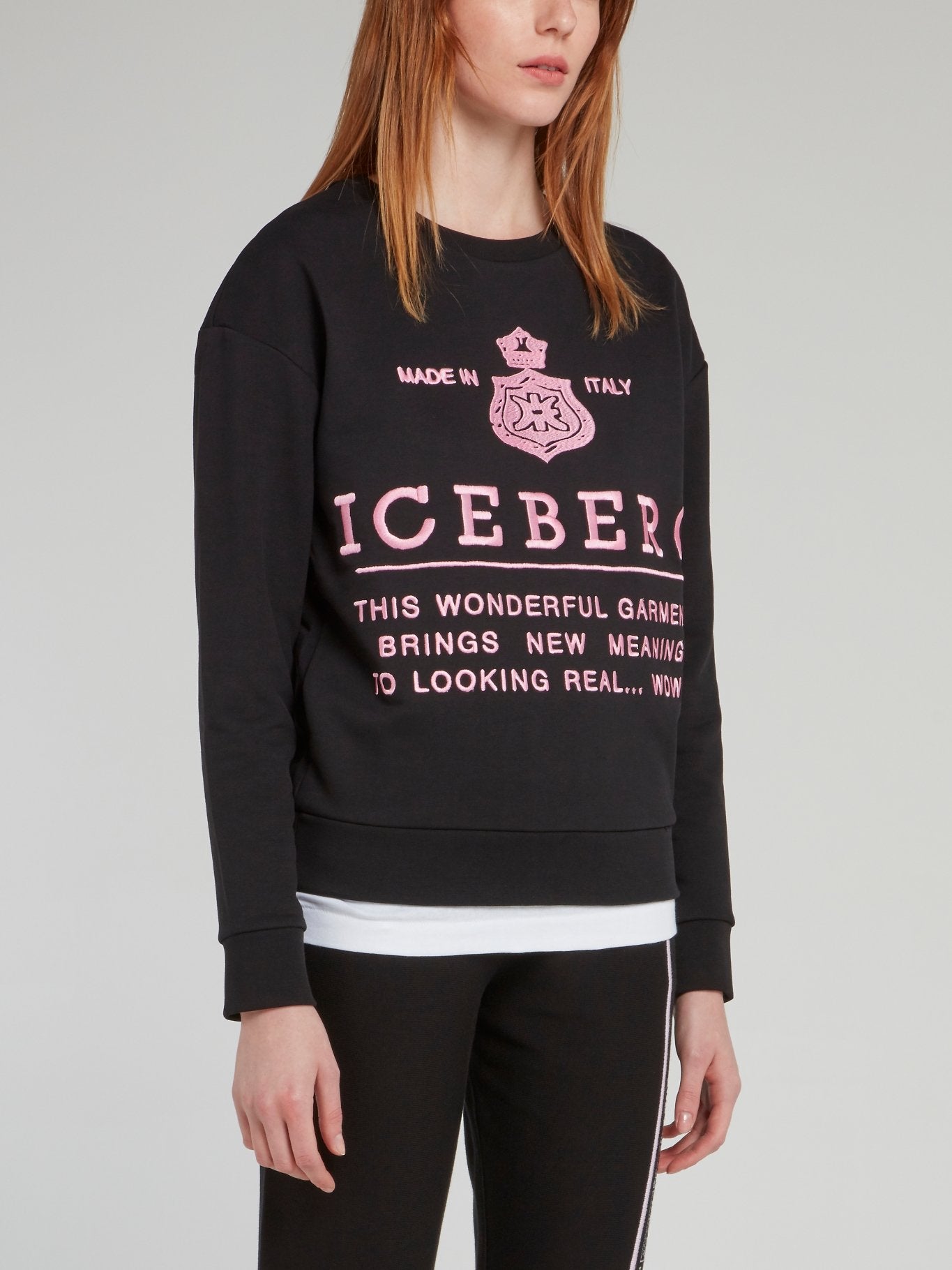 Stay comfortable and stylish this season with the Black with Pink Logo Embroidered Sweatshirt by Iceberg. Made with a soft and cozy cotton blend, this sweatshirt features a bold and eye-catching logo embroidery in vibrant pink, adding a pop of color to any outfit. Perfect for laid-back weekends, gym sessions or casual outings, it's a must-have addition to your winter wardrobe.