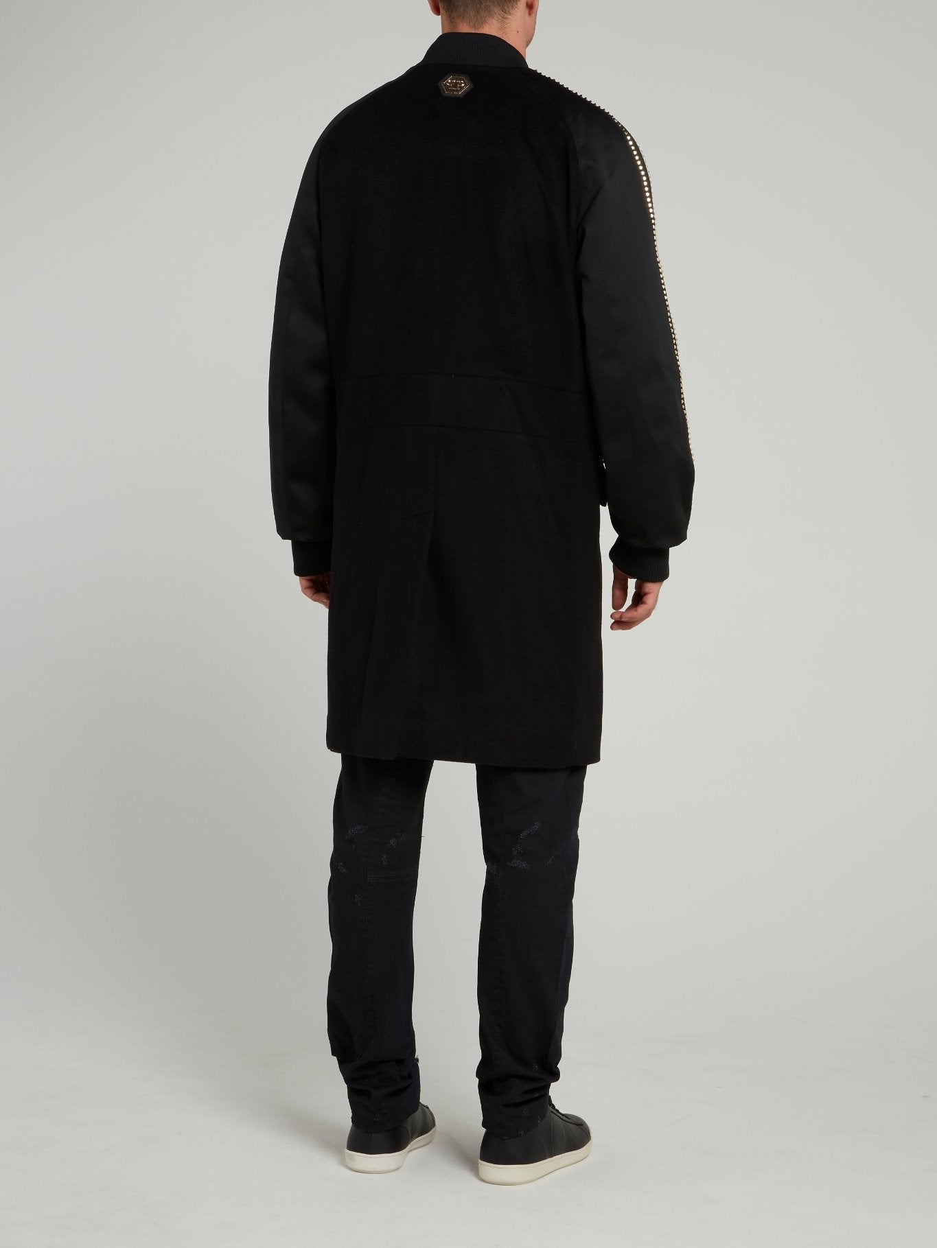 Step up your fashion game with the stunning Black Studded Sleeve Long Coat by Philipp Plein. Crafted from high-quality materials, this coat is perfect for anyone who wants to make a bold fashion statement. With its edgy studded sleeves and sleek black design, this coat will keep you warm and stylish all winter long.