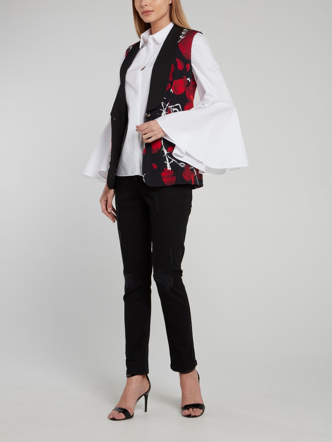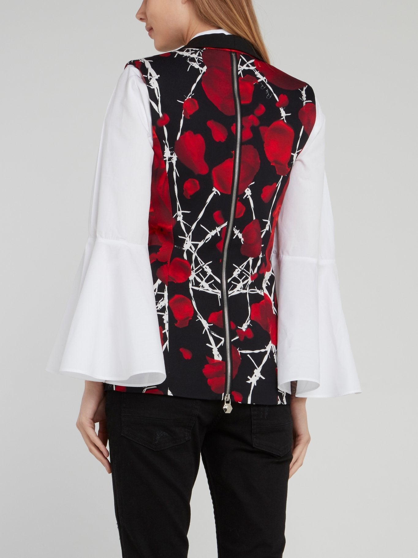 Elevate your style with the Black Rose Print Rear Zip Gilet from Philipp Plein. This edgy, yet feminine gilet is adorned with stunning rose details, creating a bold fashion statement that is sure to turn heads. The rear zip adds a touch of functionality, making it perfect for layering over your favorite tops and dresses.