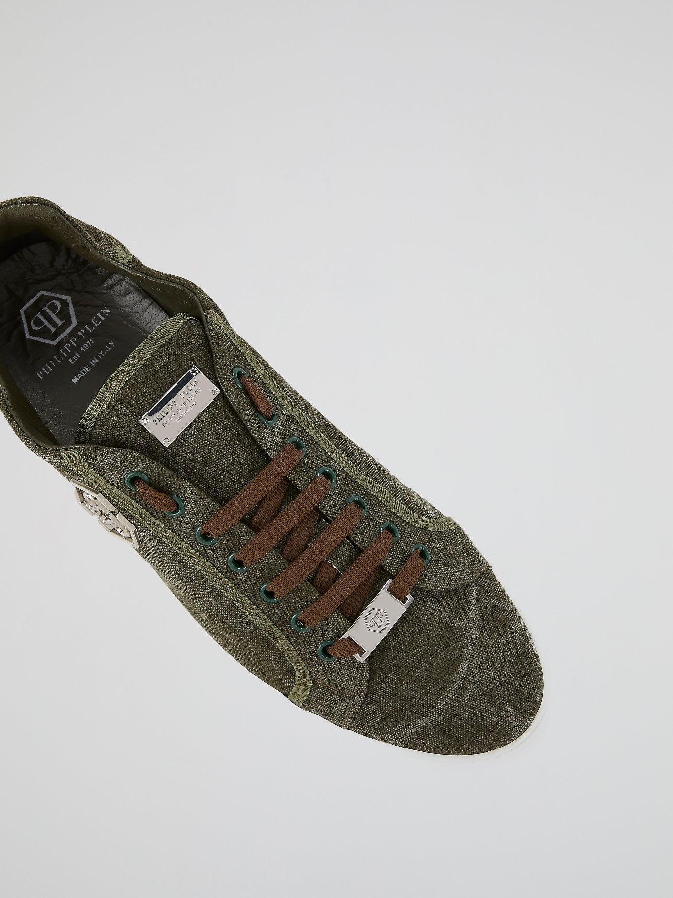 Step up your shoe game with Philipp Plein's Green Low Top Canvas Sneakers. With a sleek and stylish design, these sneakers will add a touch of sophistication to any outfit. The high-quality canvas material ensures durability and comfort, making these sneakers perfect for any occasion.