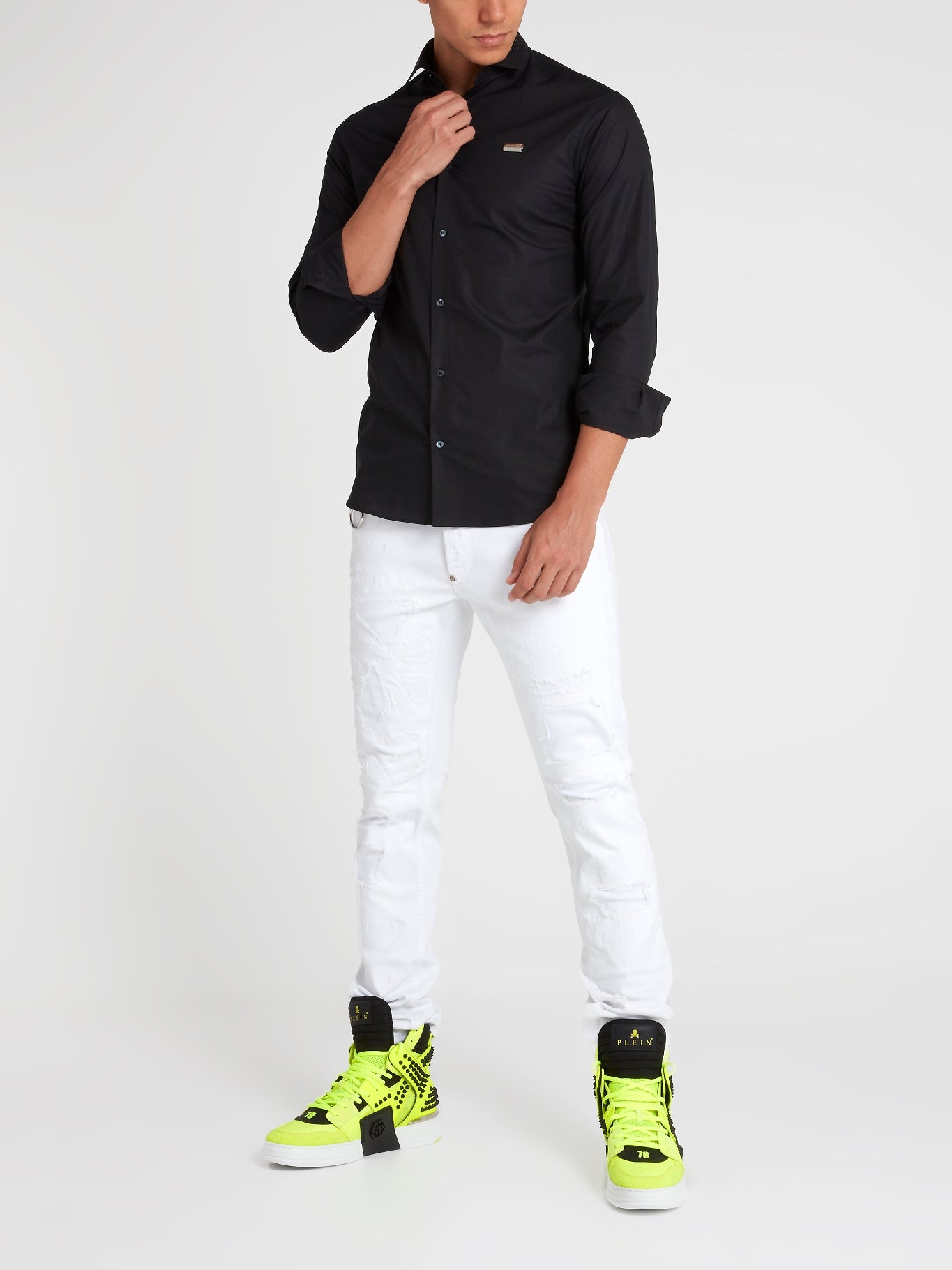 Elevate your rockstar wardrobe with the Black Studded Long Sleeve Shirt from Philipp Plein! The perfect blend of rugged and refined, this shirt boasts a sleek black design peppered with bold silver studs. Its form-fitting silhouette hugs your curves in all the right places to make you look and feel unstoppable. Are you ready to conquer the world in style?