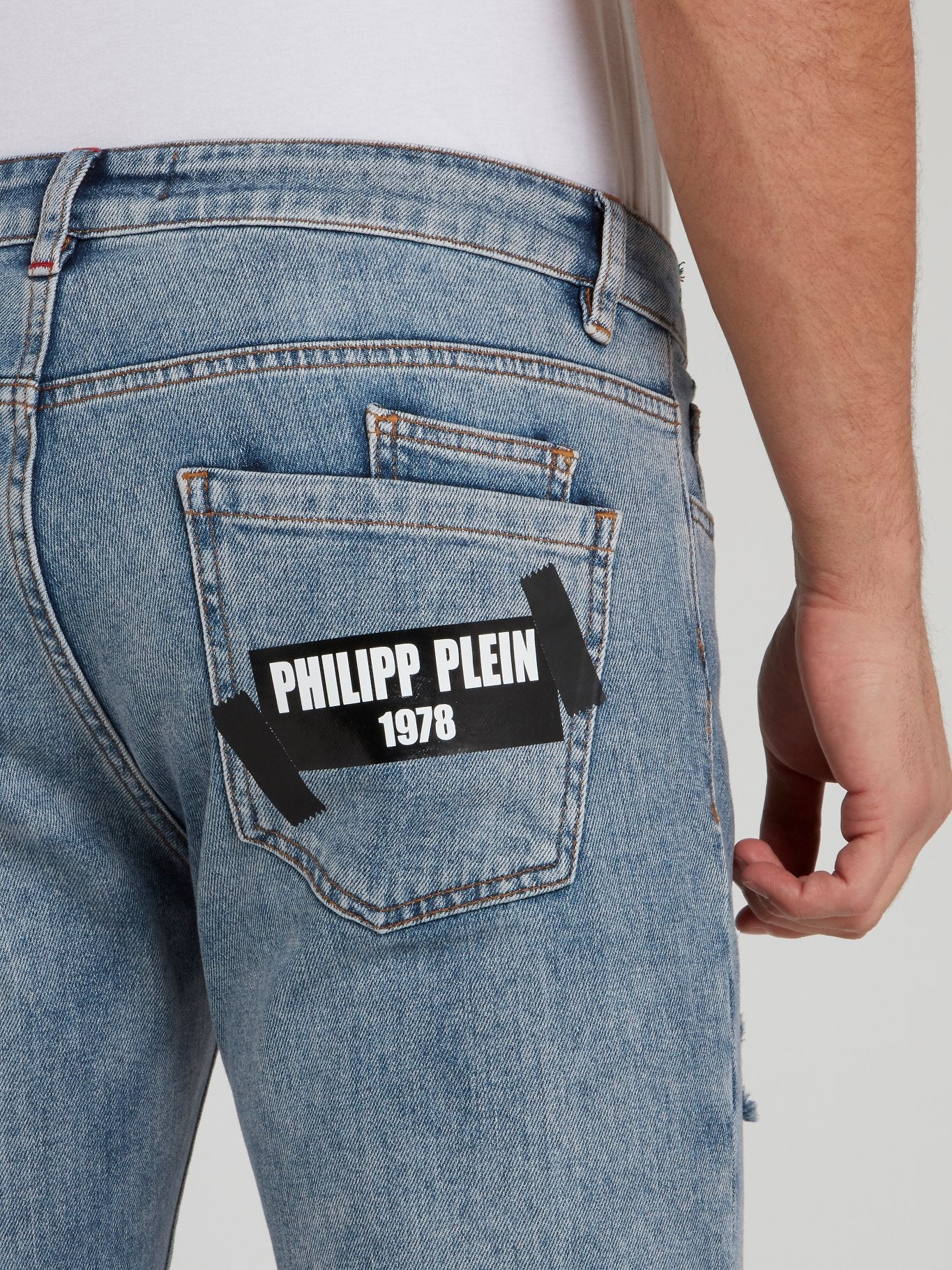 Get ready to rock the streets with these Light Blue Wash Distressed Denim Jeans by Philipp Plein. Crafted with premium quality materials, these jeans offer a perfect blend of style and comfort. With unique distressed details, the jeans showcase a rebel-like image that will add an edgy touch to your wardrobe.