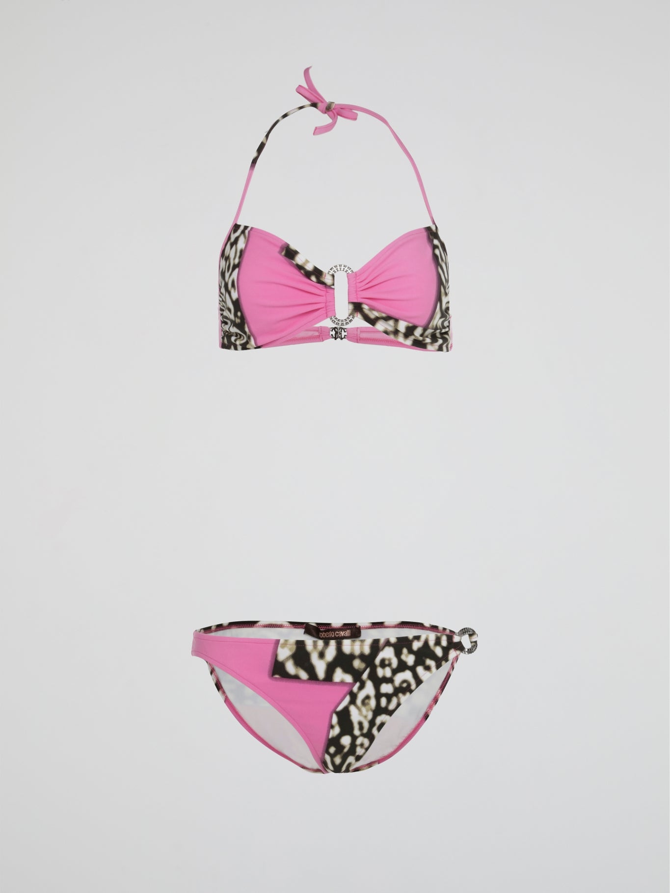 Indulge in the untamed allure of the Pink Leopard Print Bikini Set by Roberto Cavalli. This head-turning swimsuit boasts both style and substance, featuring a classic bralette top with adjustable straps and a high-waisted bottom for a flattering, fashion-forward fit. Make your beachside or poolside presence known with the distinctive, bold animal print and high-quality craftsmanship iconic to the Roberto Cavalli brand.