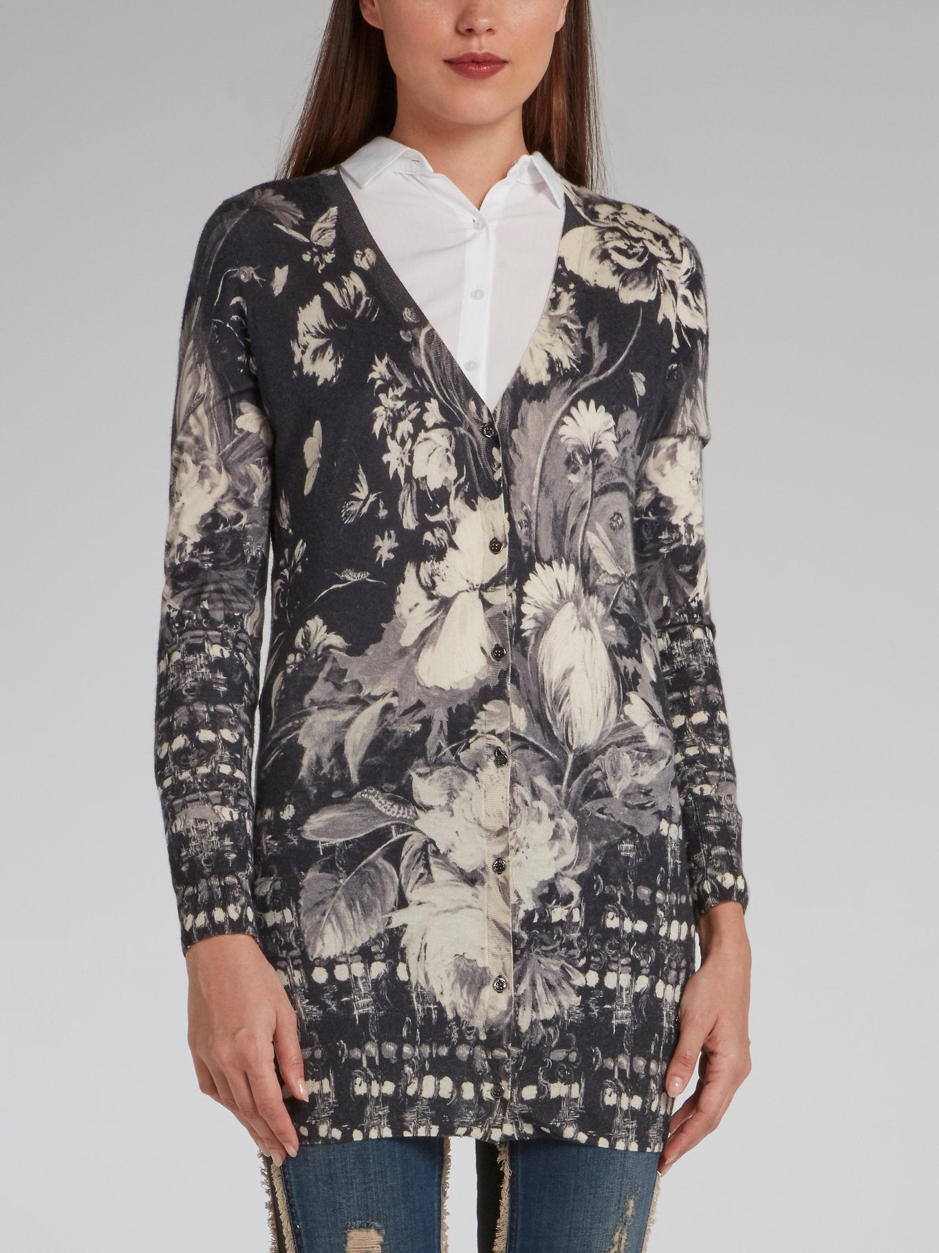 Indulge in the breathtaking elegance of the Grayscale Floral Print Cardigan from Roberto Cavalli. The mesmerizing fusion of the softest cashmere and silk fabric in grayscale and floral prints makes it the perfect statement piece to incorporate a touch of luxury to your wardrobe. The flattering silhouette, adorned with stunning floral embroidery, finely crafted in Italy to provide you with unparalleled comfort and sophistication.