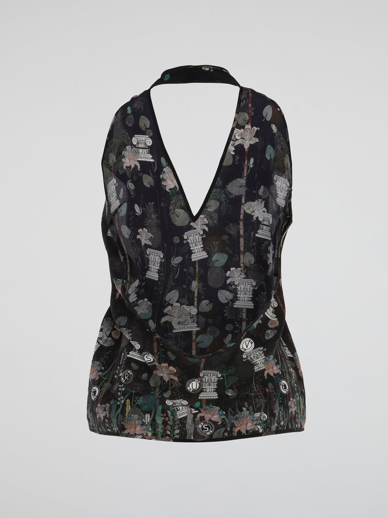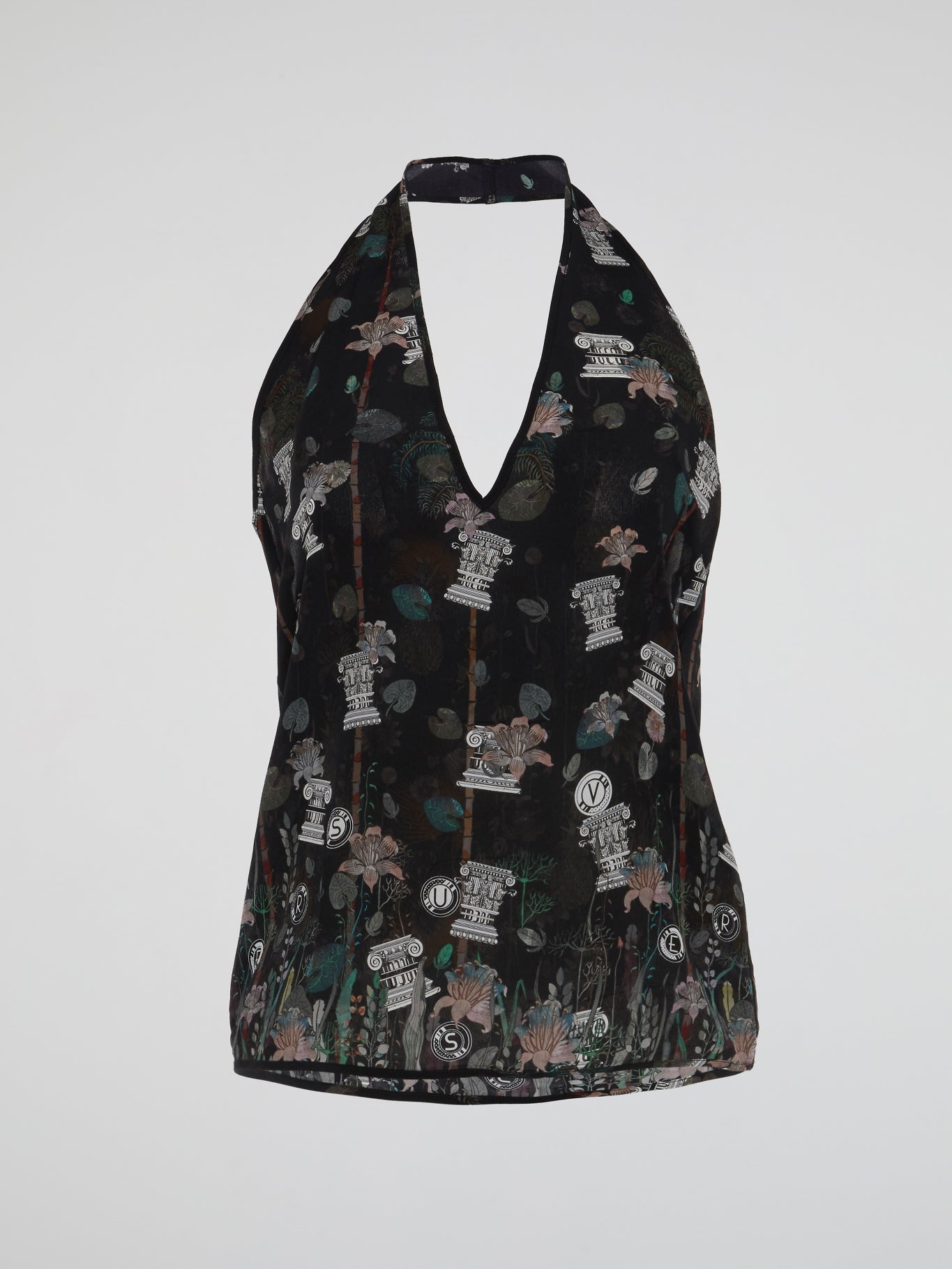 Embrace effortless elegance with this stunning Halter Neck Velvet Top by Versus Versace, featuring a deep V-neckline and an enchanting botanical print. The luxurious black velvet base is adorned with intricate floral and architectural motifs, adding a touch of mystery and sophistication. Designed for a flattering fit, this top secures at the neck for a sleek and refined silhouette. Perfect for evening outings, chic casual looks, or layering under a statement blazer. Pair it with high-waisted trousers or a flowing skirt for a captivating style.