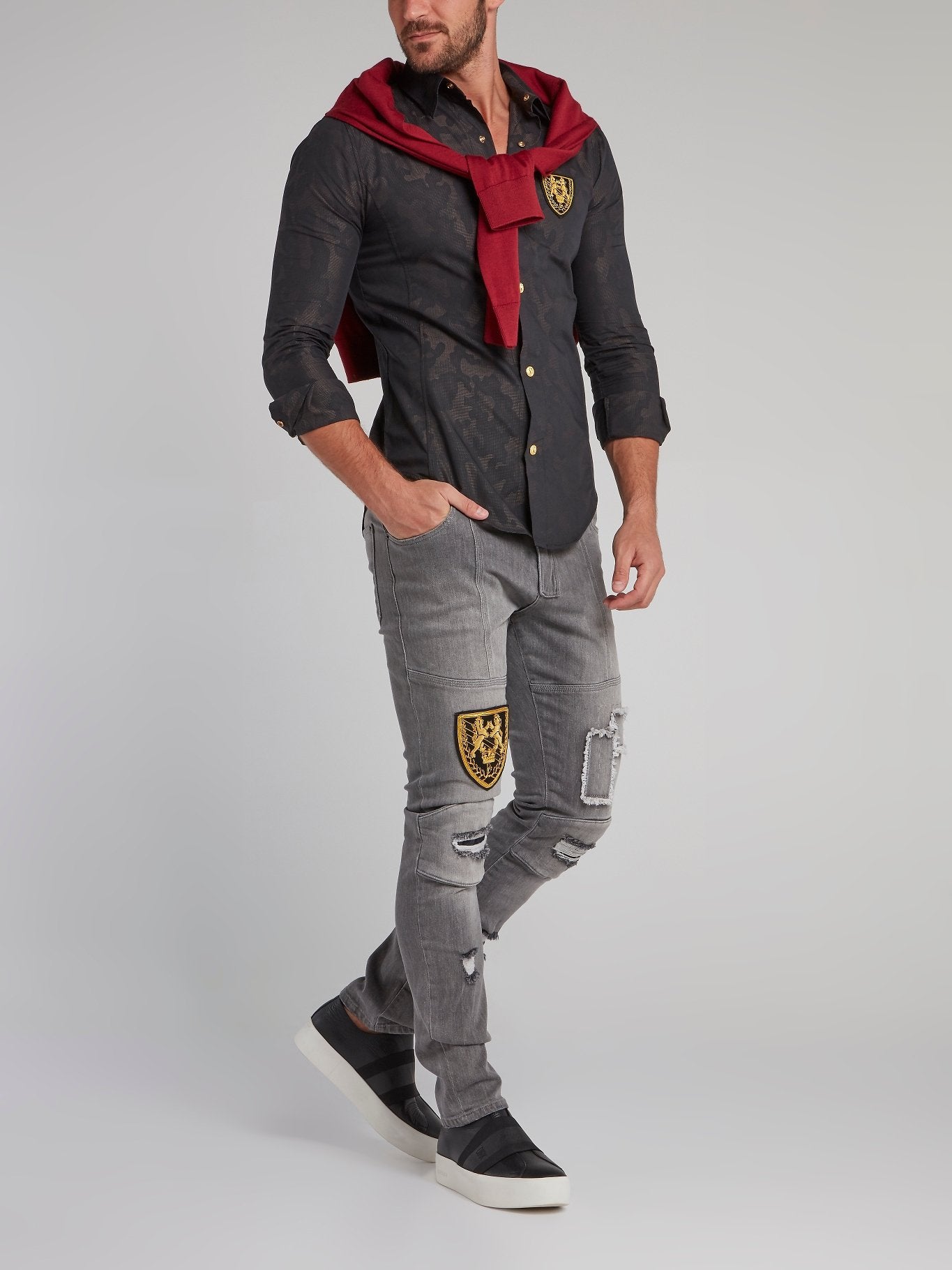 Introducing the Black Button Up Camo Shirt from Richard Valentine, the perfect juxtaposition of edge and sophistication. With its bold camo print and sleek black base, this shirt is the ultimate statement piece for the daring fashionista. Crafted from premium quality materials, you won't find anything like it anywhere else.
