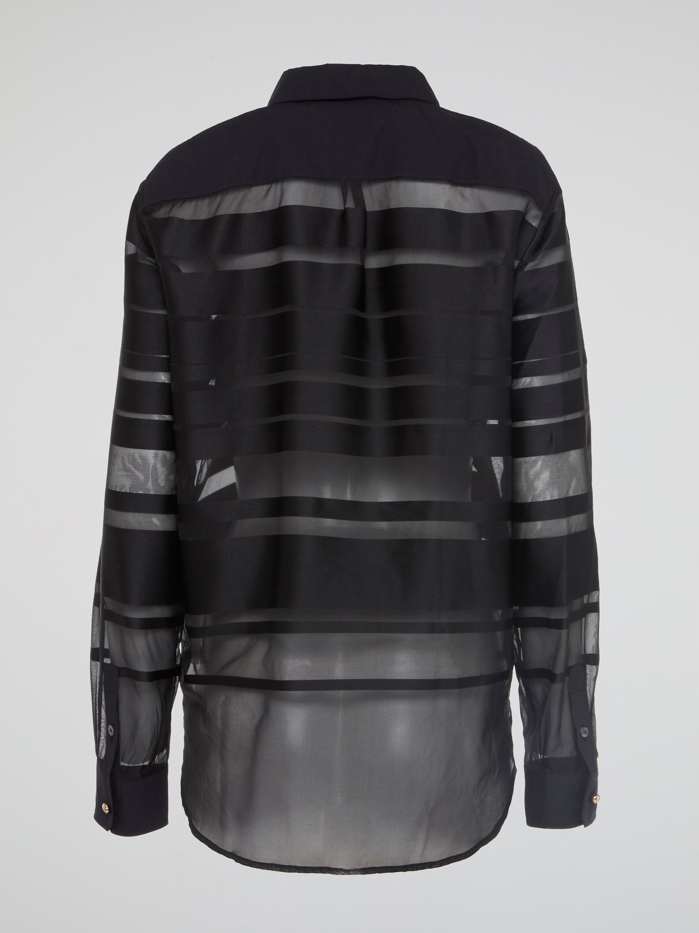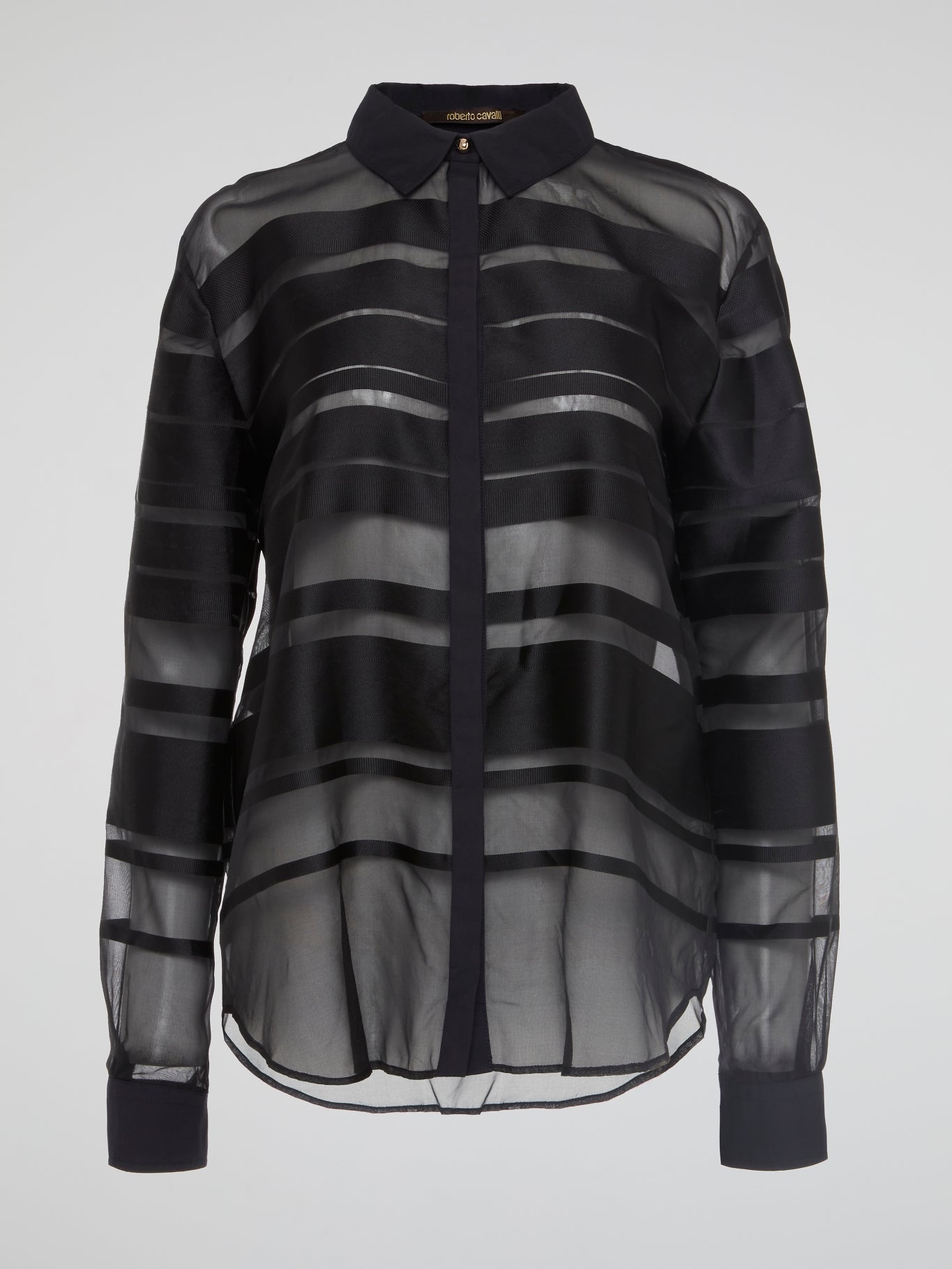 Feel like a mysterious enchantress in the Black Sheer Panel Blouse by Roberto Cavalli. This stunning piece will effortlessly elevate any outfit with its delicate sheer fabric and intricate panel design. Embrace your inner goddess and captivate the crowd in this must-have statement piece.
