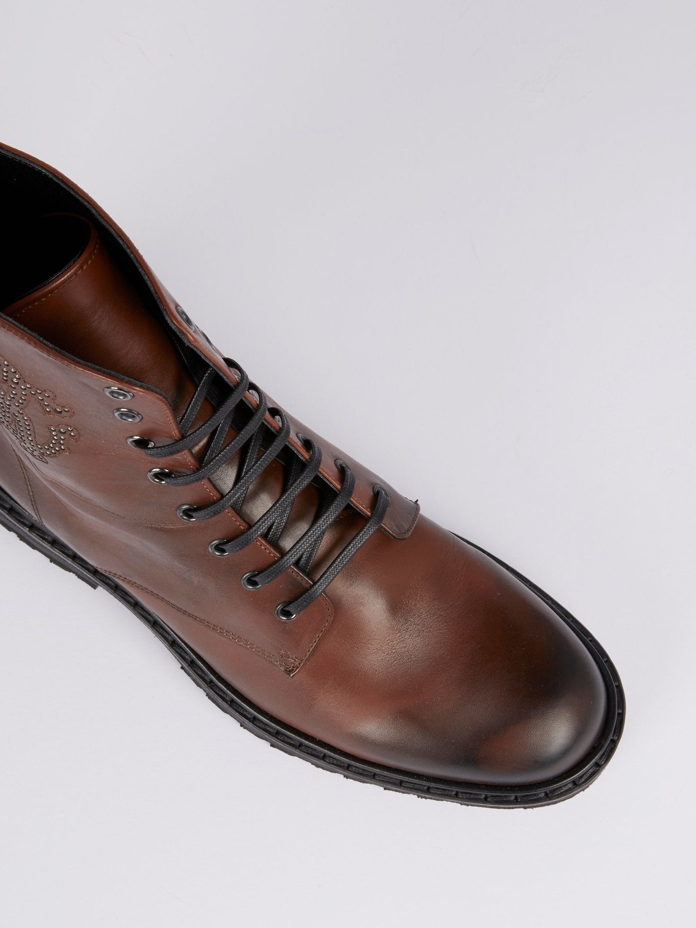 Step out in style with the Rustic Studded Monogram Leather Boots from Roberto Cavalli. Made with superior quality leather, these boots are perfect for those who like to make a statement wherever they go. The studded monogram adds a touch of elegance, while the rustic finish lends a rugged charm to your look.