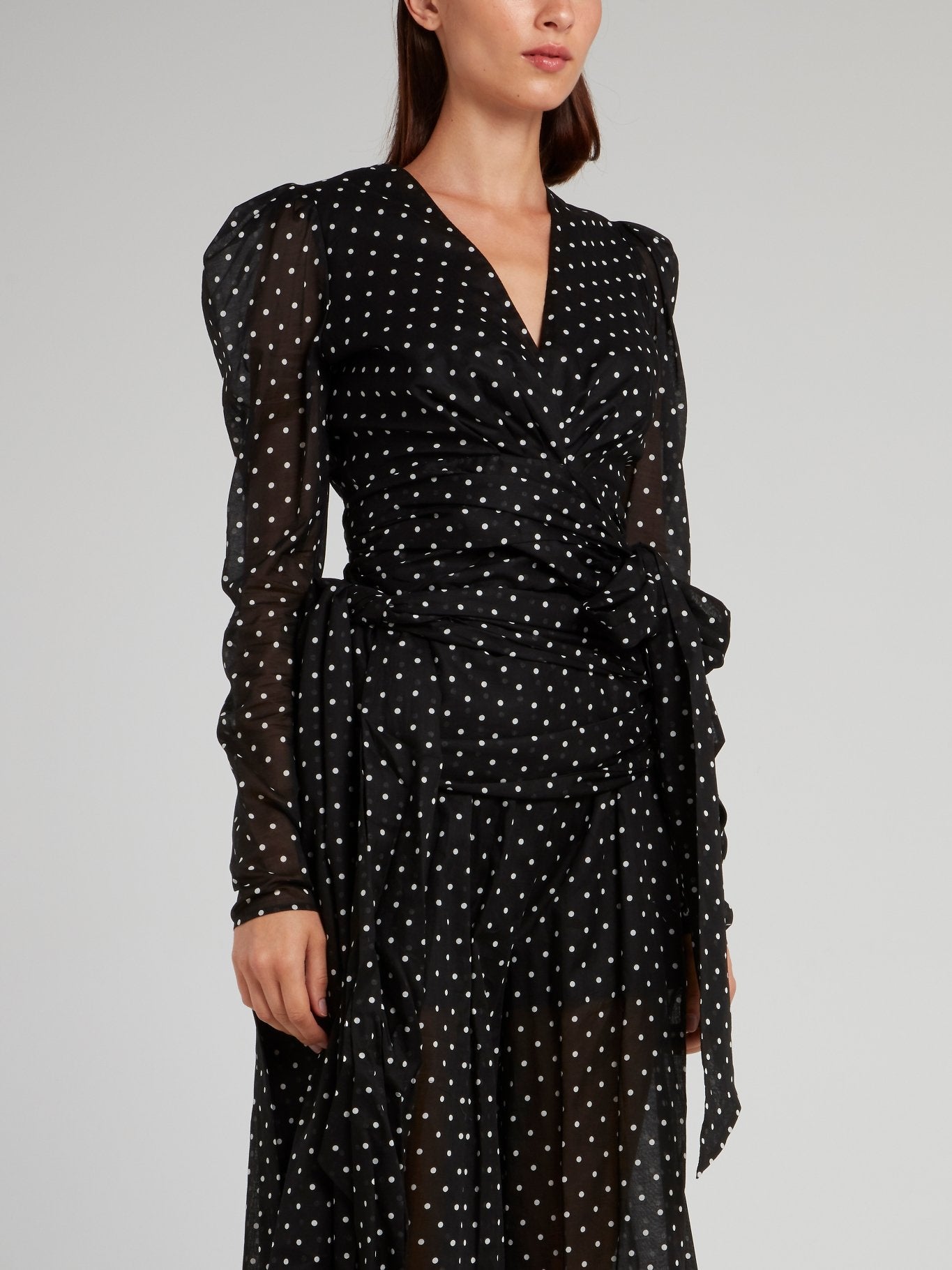 Indulge in the timeless allure of the Black Polka Dot Wrap Top designed by Alexandre Vauthier. The wrap design flaunts your curves stunningly while the playful polka dots bring out your youthful vibe. Its chic and versatile look makes it perfect for any occasion, whether it's a casual day out with friends or a dinner extravaganza.