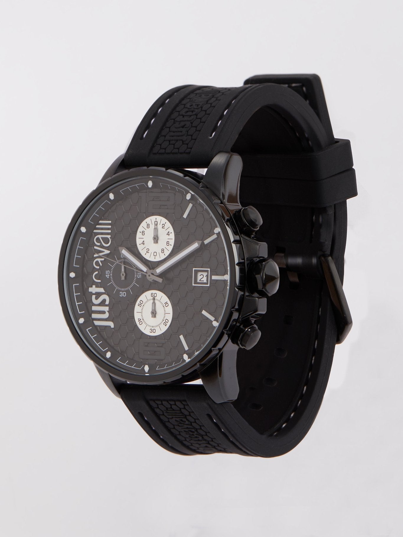 Get ready to dazzle everyone around you with the Black Rubber Strap Chronograph Watch from Just Cavalli! This timepiece is the perfect blend of style and substance, featuring a sleek black rubber strap and a glossy black dial with striking silver accents. Whether you're dressing up or down, this watch is sure to add that extra pop of sophistication to any outfit.