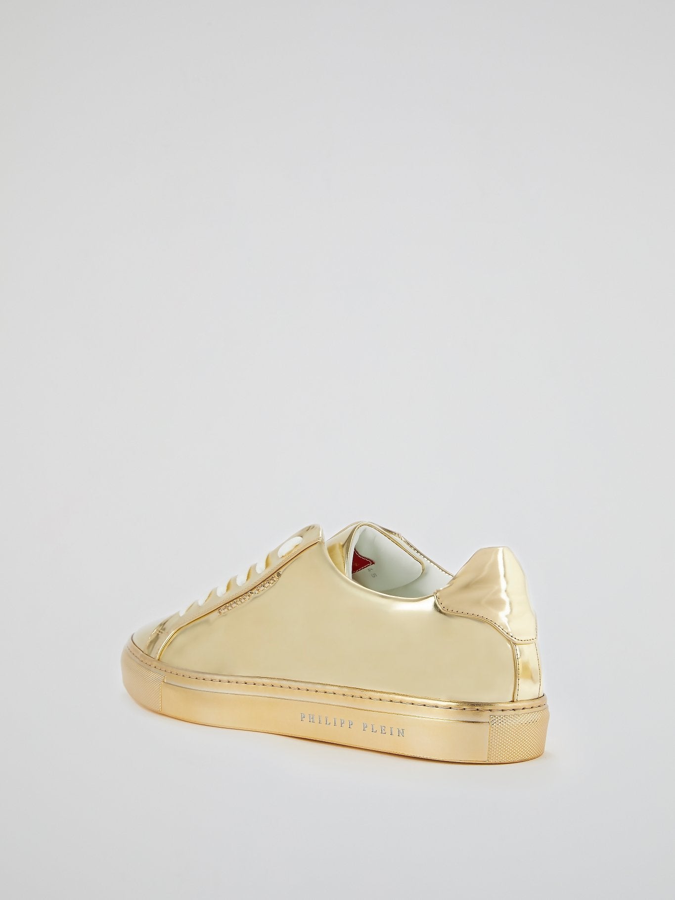 Step into the limelight with these stunning Gold Statement Low Top Sneakers from Philipp Plein. Crafted from premium materials, these sneakers exude luxury and sophistication at every angle. The golden metallic accents and bold detailing add a touch of glamour to any outfit, making them the perfect choice for those who like to make a statement with their fashion choices.
