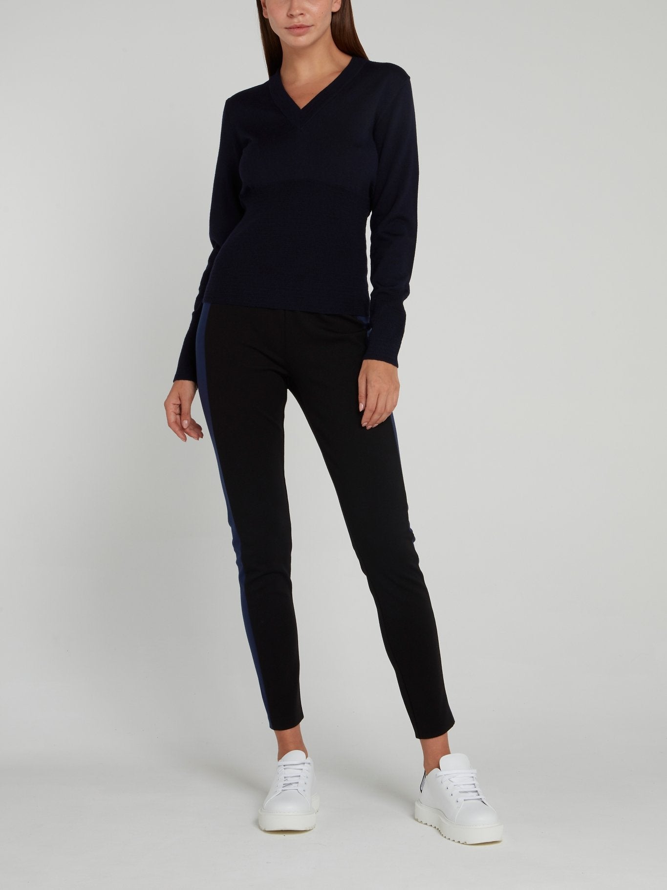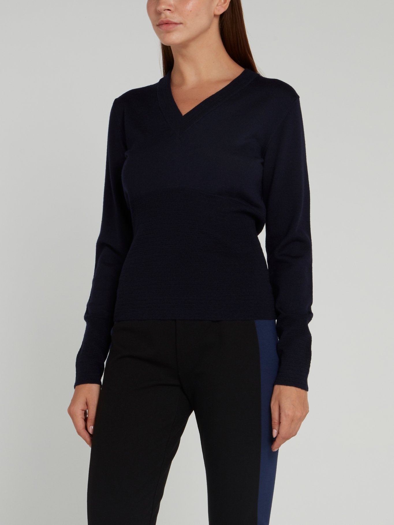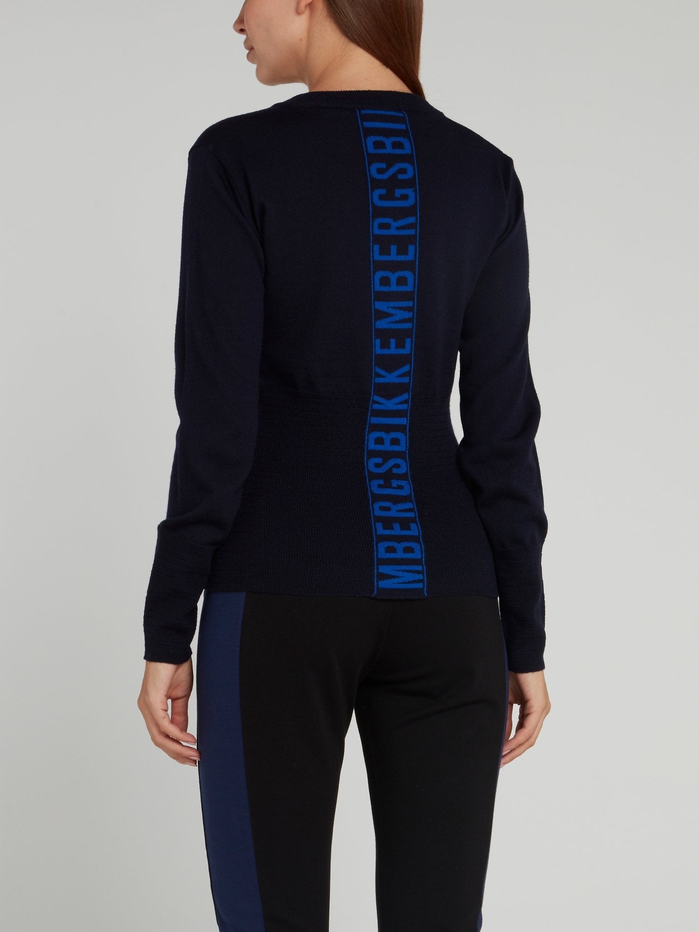 Темно-синий свитер с V-образным вырезом и логотипом на спине