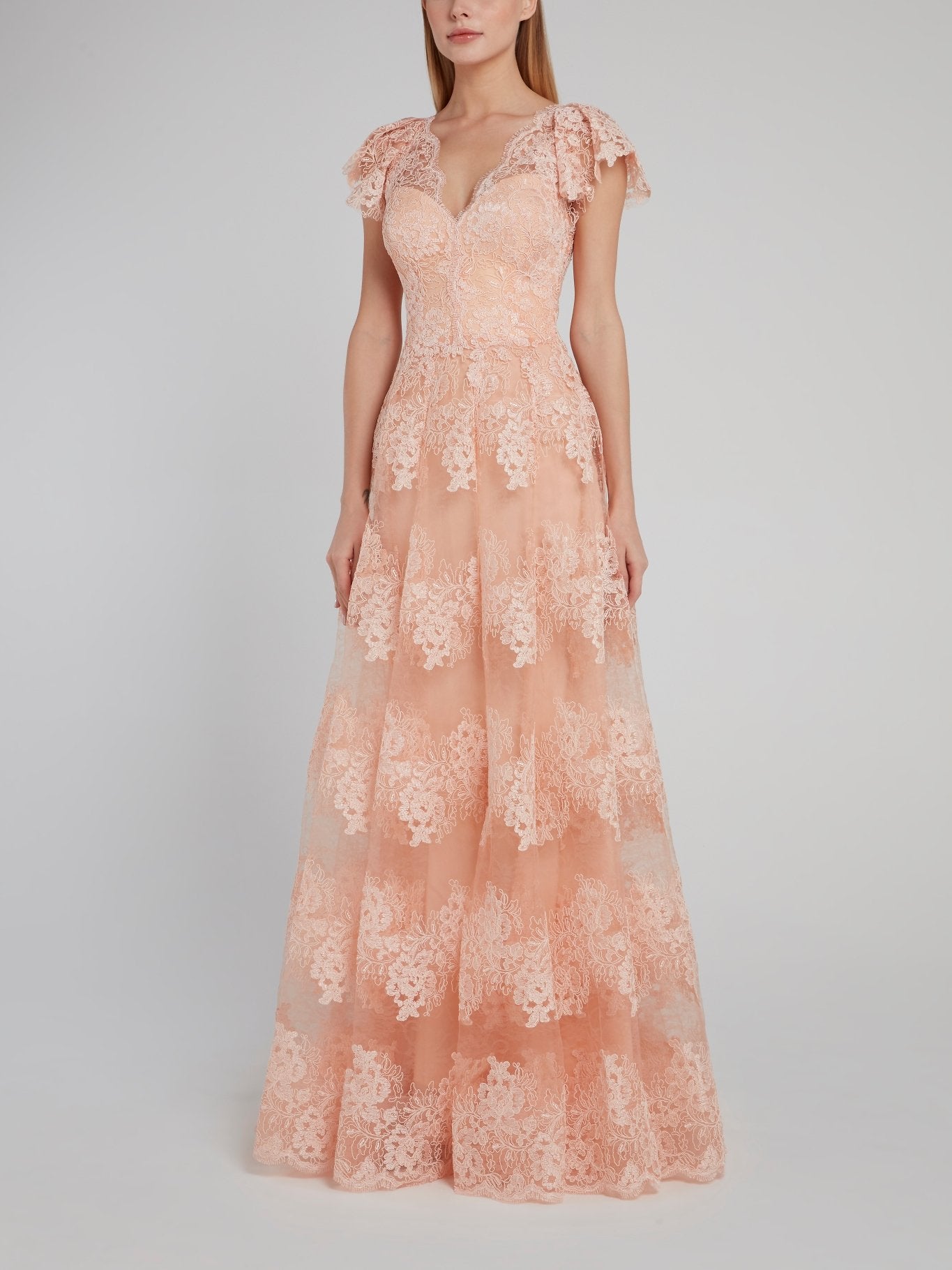 Бежевое платье-макси с плиссировкой и цветочным кружевным принтом