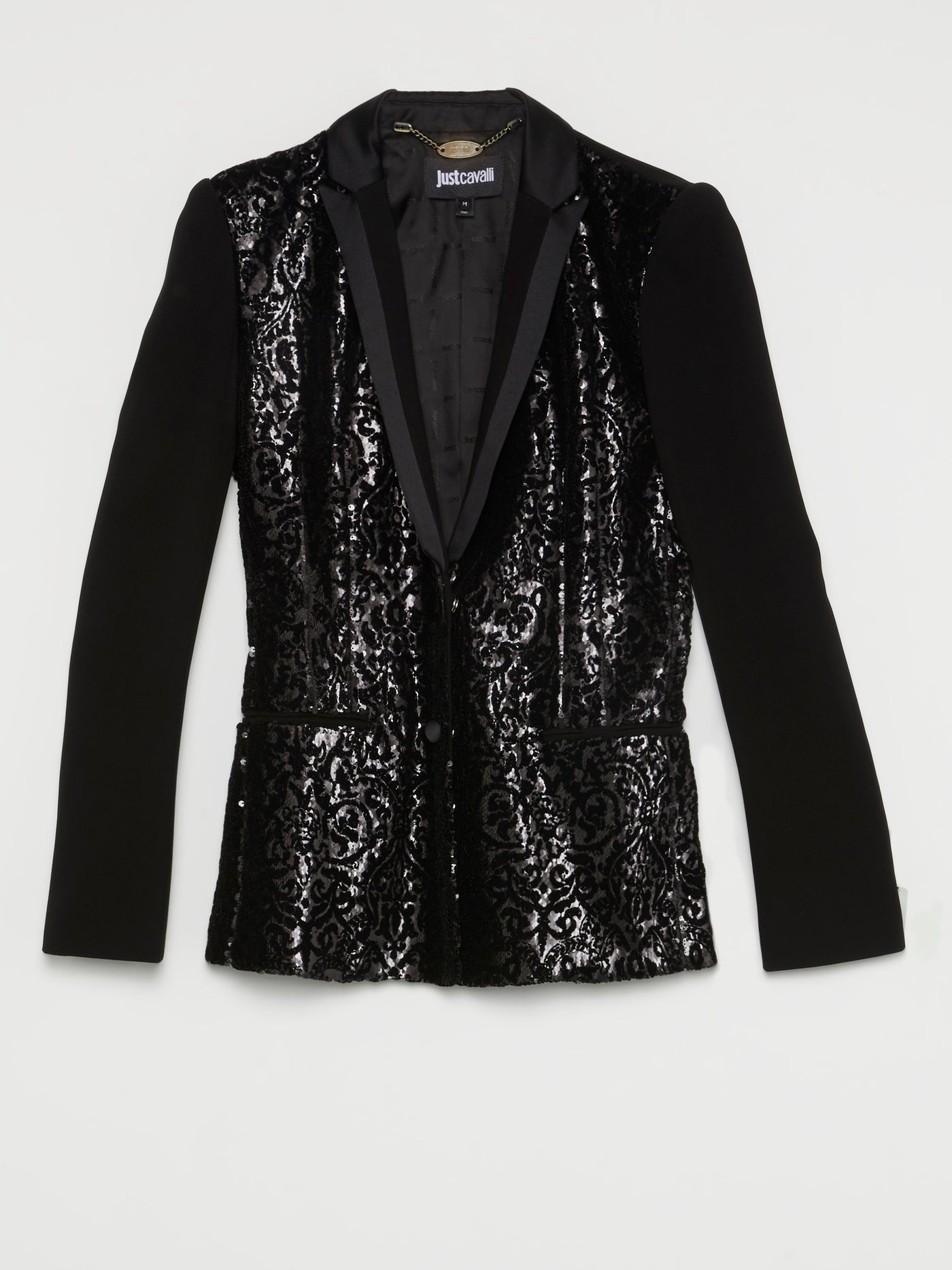 Introducing the Black Sequin Baroque Blazer by Just Cavalli, your ultimate style statement for any occasion! This luxurious blazer boasts intricate baroque patterns and shimmering sequins, making it the perfect addition to your wardrobe for those special nights out. Pair it with tailored pants or jeans and elevate your look to new heights!