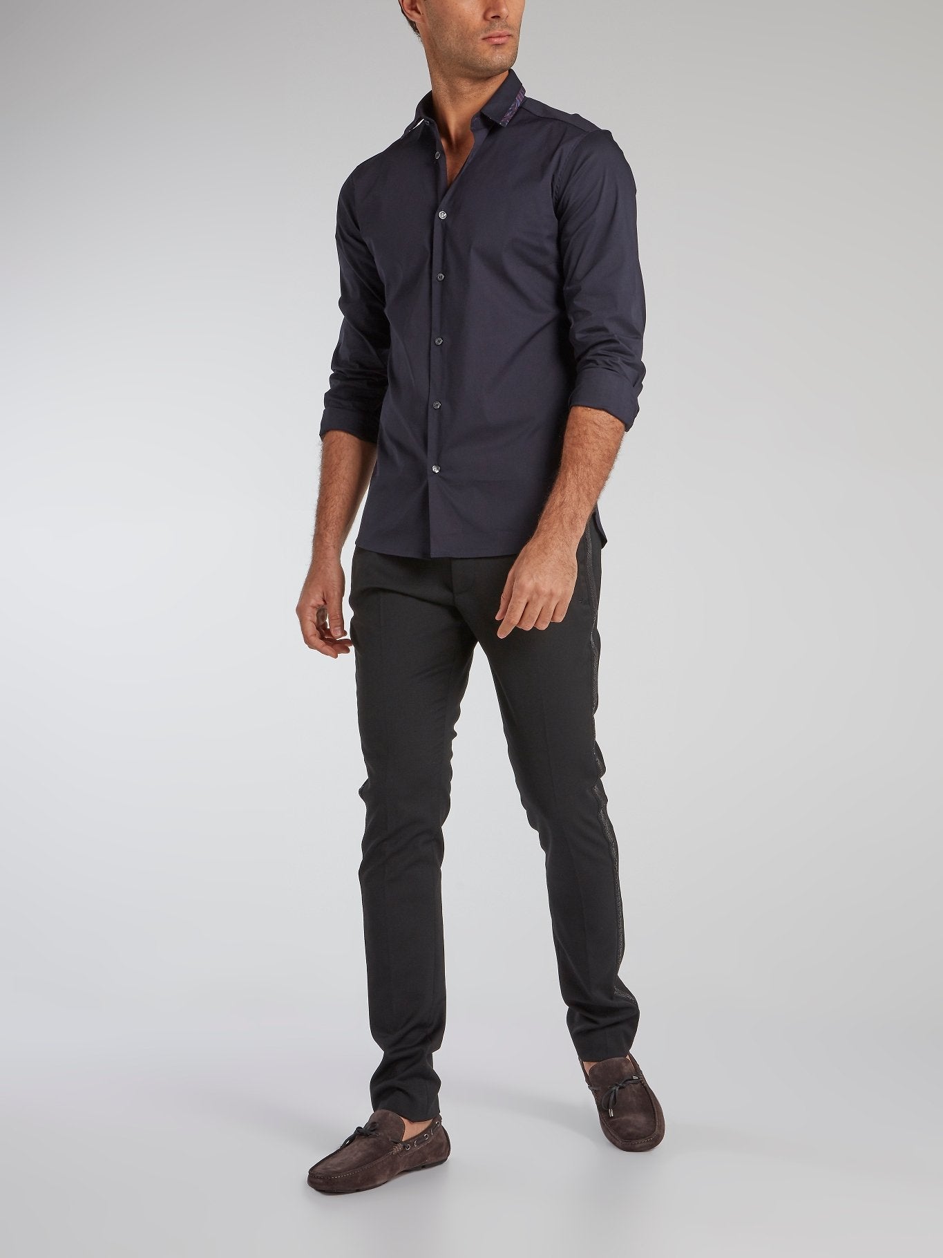 Introducing the must-have Black Embellished Suit Pants from the iconic designer Just Cavalli! This statement piece features bold embellishments running down the legs, adding a touch of glamour to your professional wear. Made with premium fabrics and expert craftsmanship, these pants are both comfortable and stylish, perfect for any occasion from the office to a night out on the town.