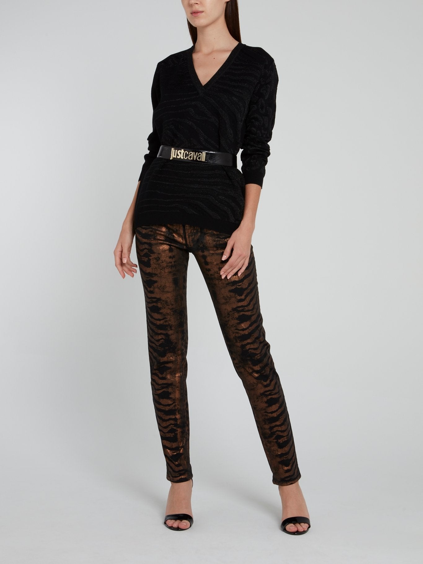 Черный блестящий пуловер с V-образным вырезом и анималистическим принтом