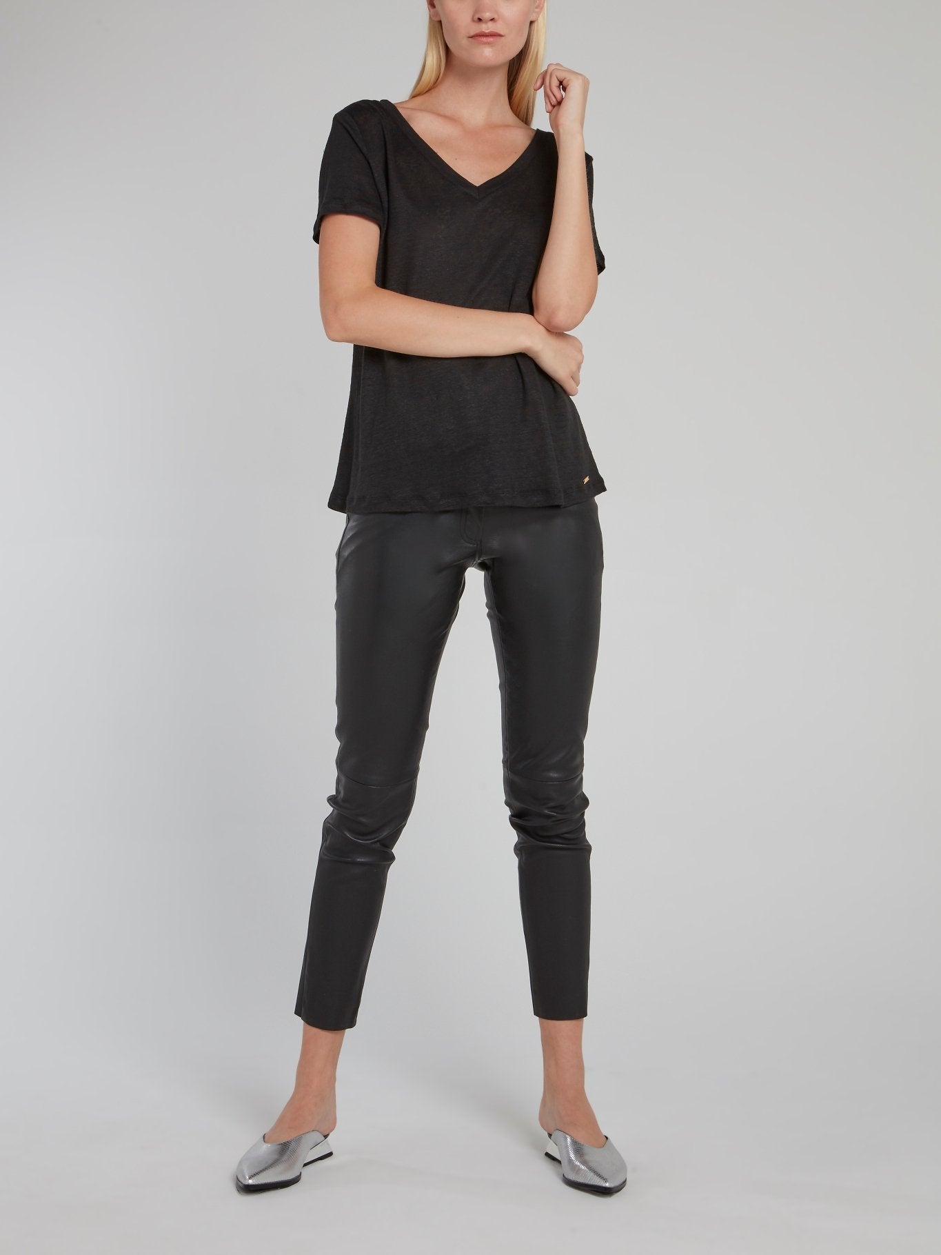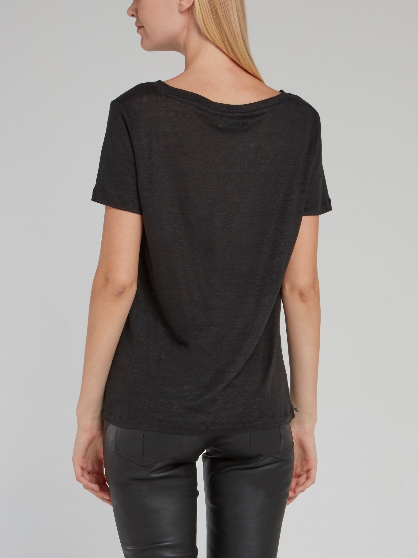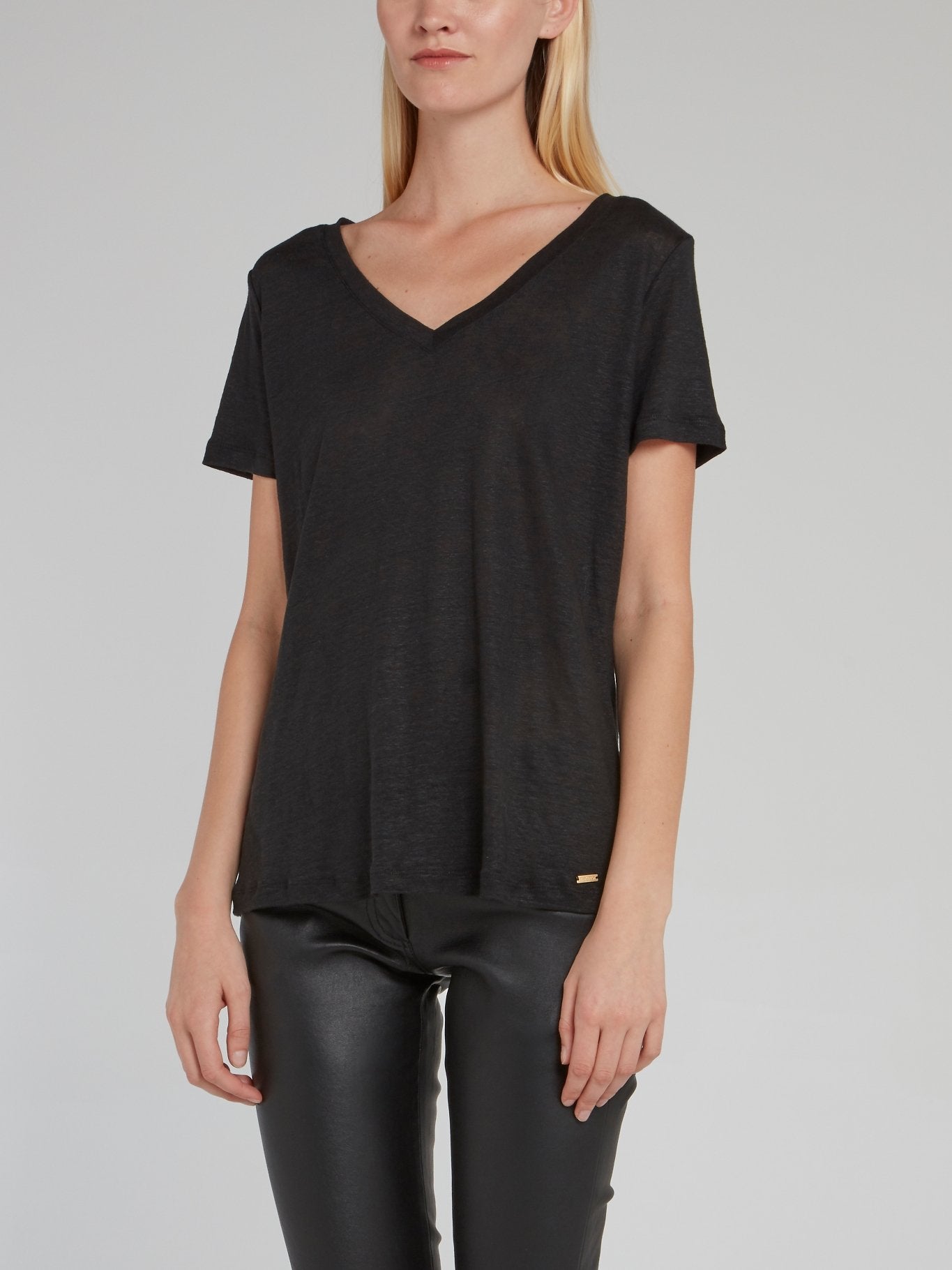 Черная льняная футболка с V-образным вырезом