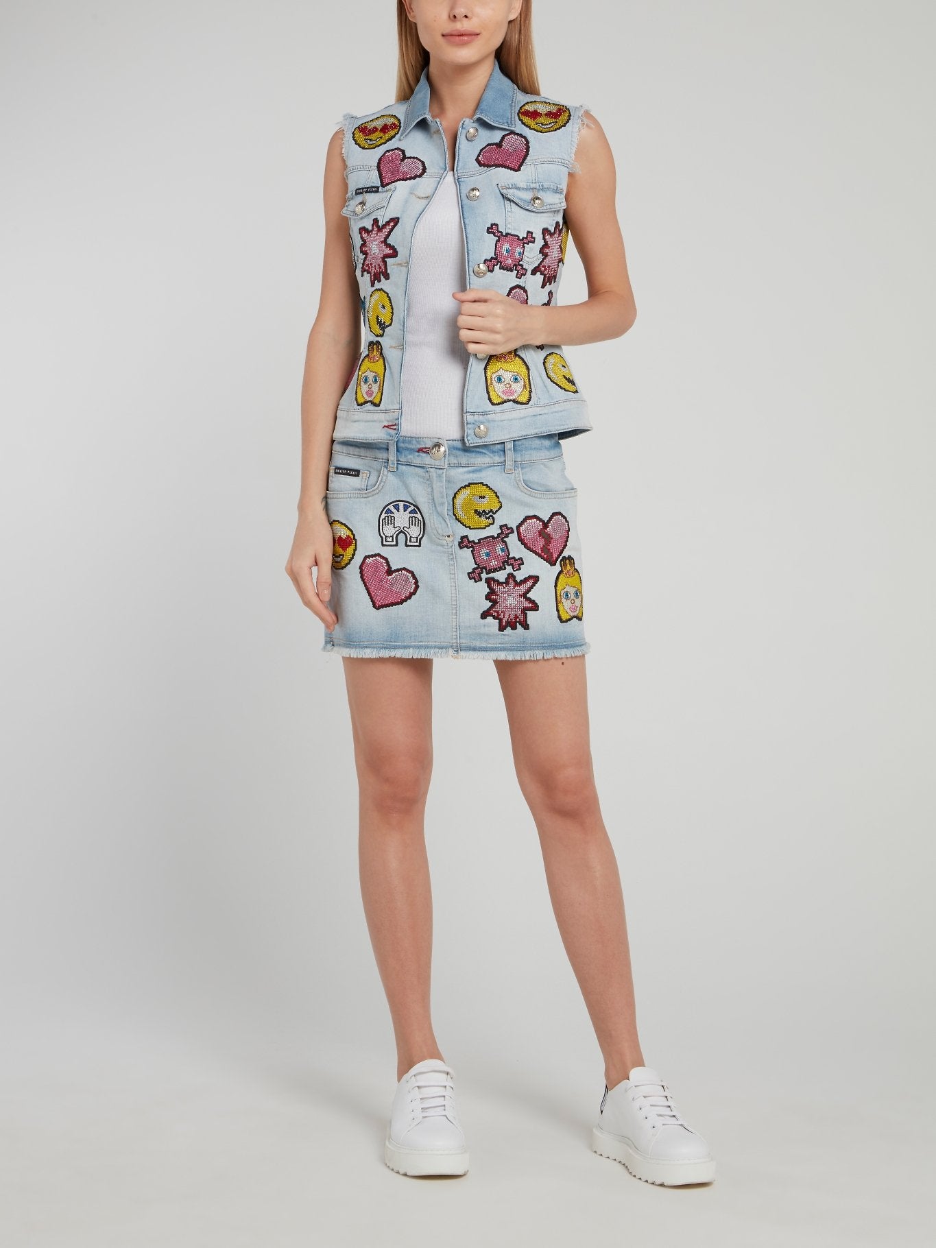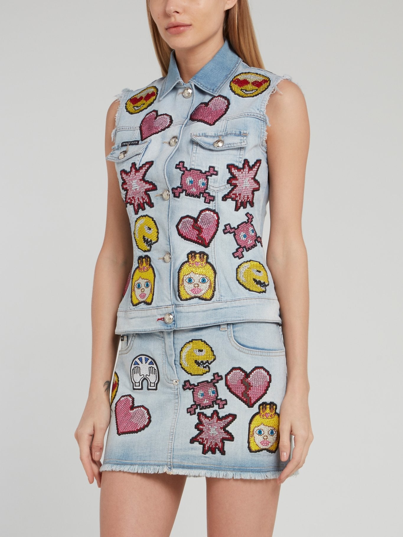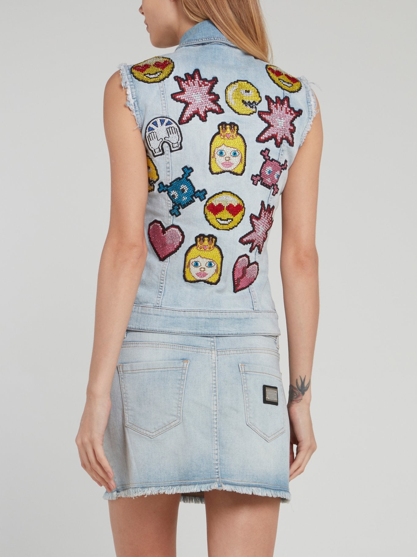 Синий джинсовый жилет с необработанным краем и вышивкой Emoji