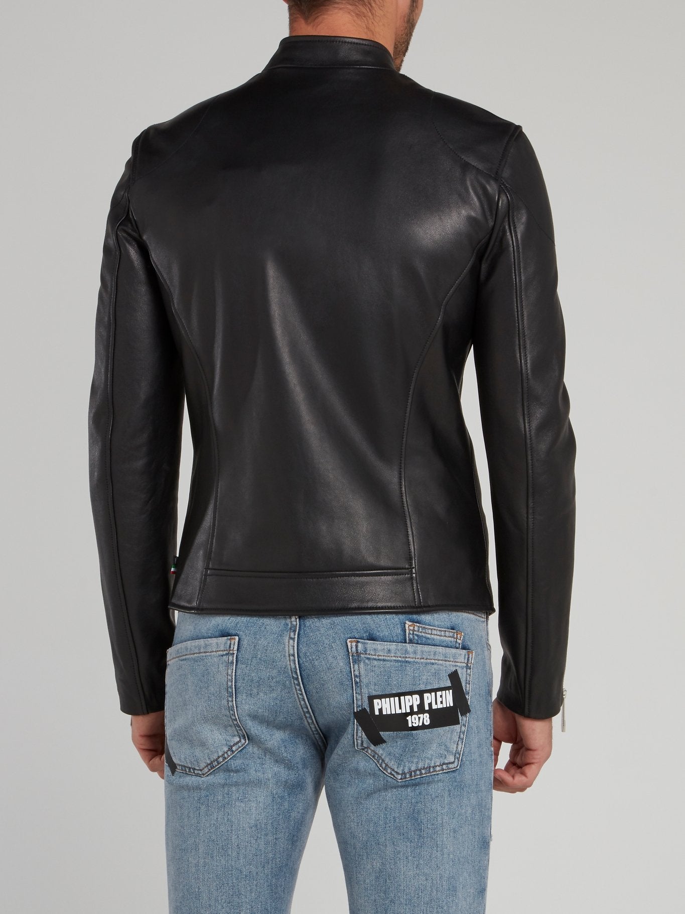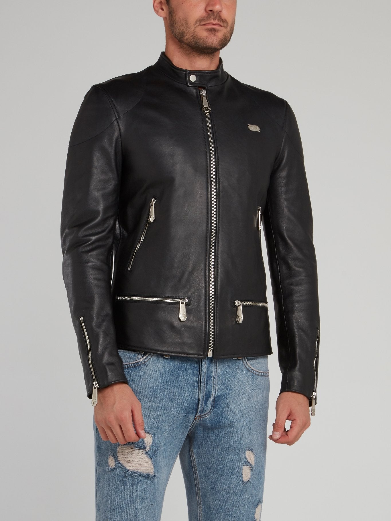 Черная байкерская кожаная куртка с застежкой на воротнике