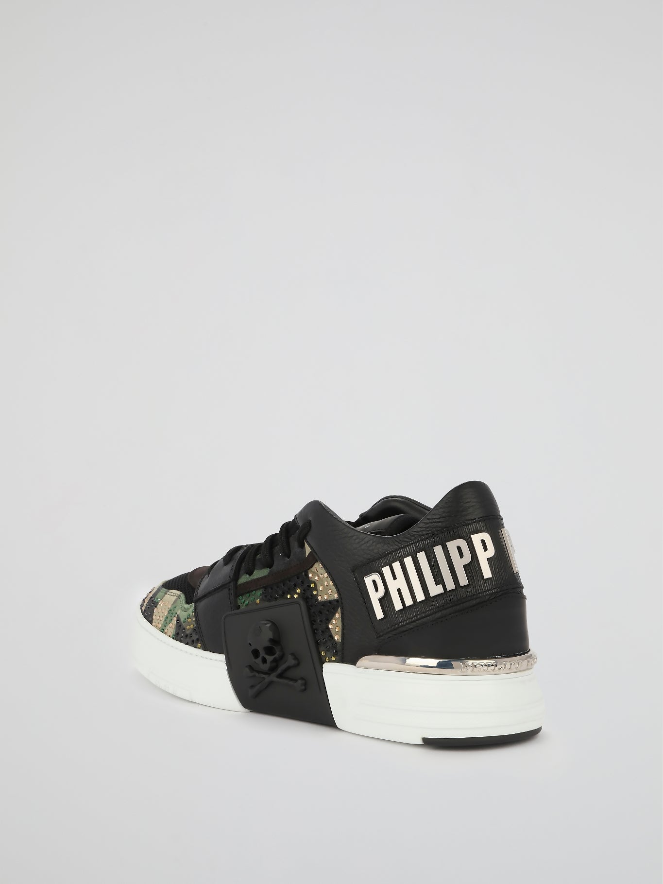 Elevate your sneaker game with the Crystal Detail Camo Low Top Sneakers by Philipp Plein. These shoes are not your average kicks, featuring a unique camo print accented with sparkling crystals on the side. Crafted with the highest quality materials, these sneakers are both stylish and comfortable, perfect for the modern trendsetter looking to make a statement.