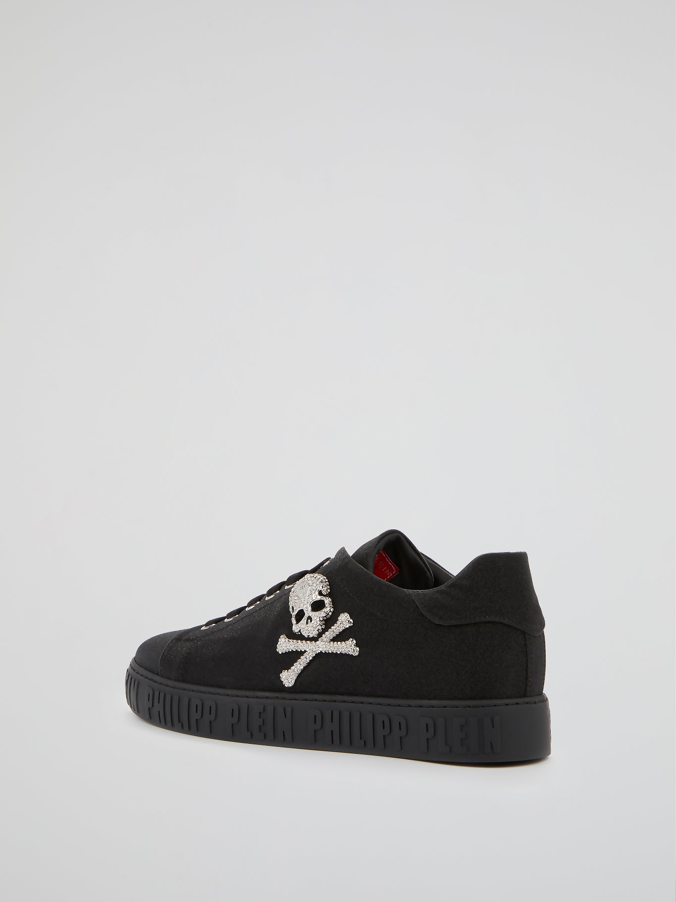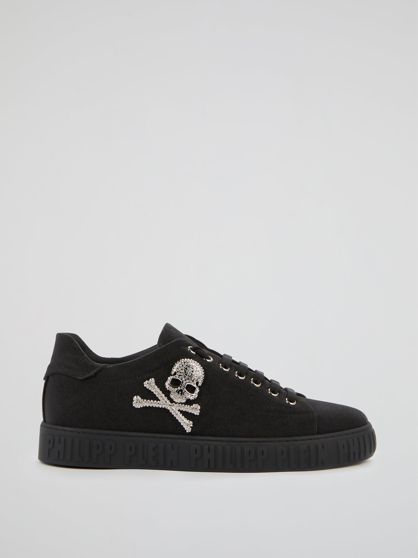 Step up your sneaker game with the edgy and glamorous Black Crystal Skull Sneakers by Philipp Plein. These classic low-top sneakers feature a luxurious black leather body embellished with an intricate crystal skull symbol, creating a bold and mystical statement. Perfect for elevating any casual outfit or adding that extra sparkle to a night out.