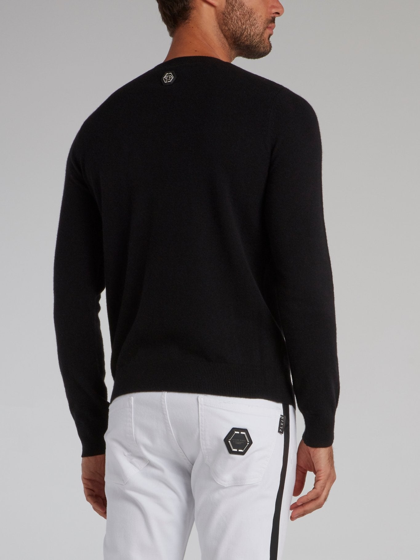 Elevate your wardrobe with the edgy and chic Black Studded Skull Pullover by Philipp Plein. Crafted from premium quality materials, this pullover is adorned with metallic studs and features a bold skull design that adds a rebellious touch to any outfit. Whether you're dressing up for a night out or adding an edge to your casual day look, this versatile piece is a must-have for any fashion-forward individual.