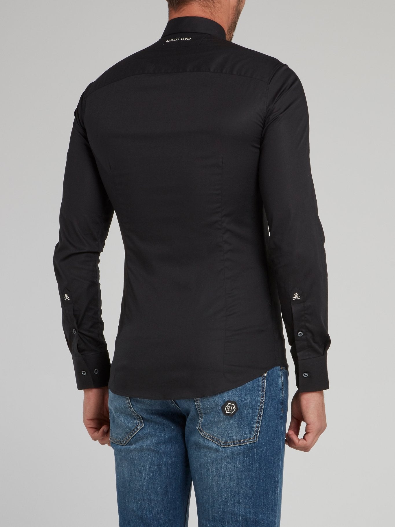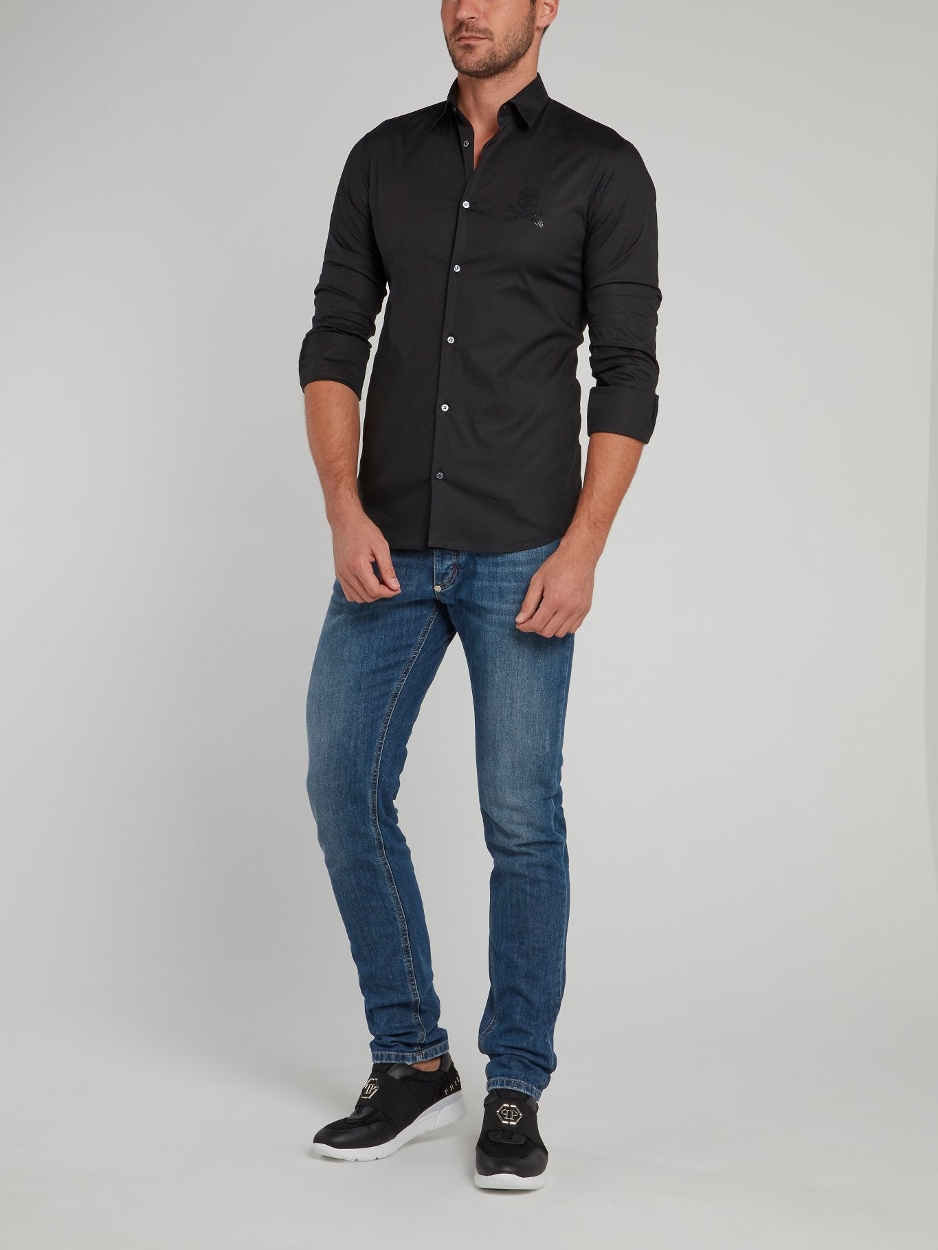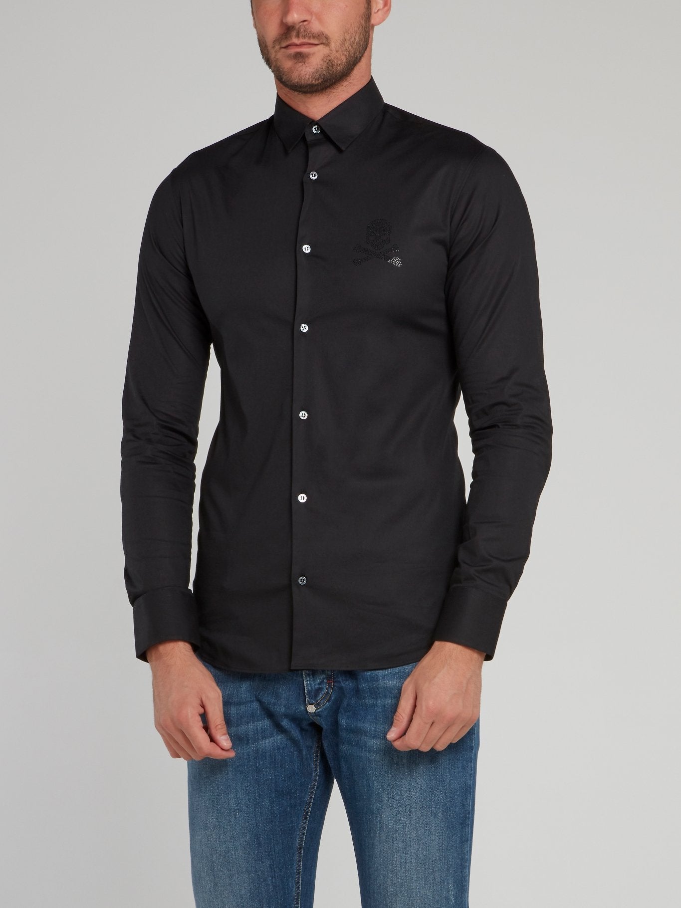 Черная рубашка с длинными рукавами, изображением черепа и стразами