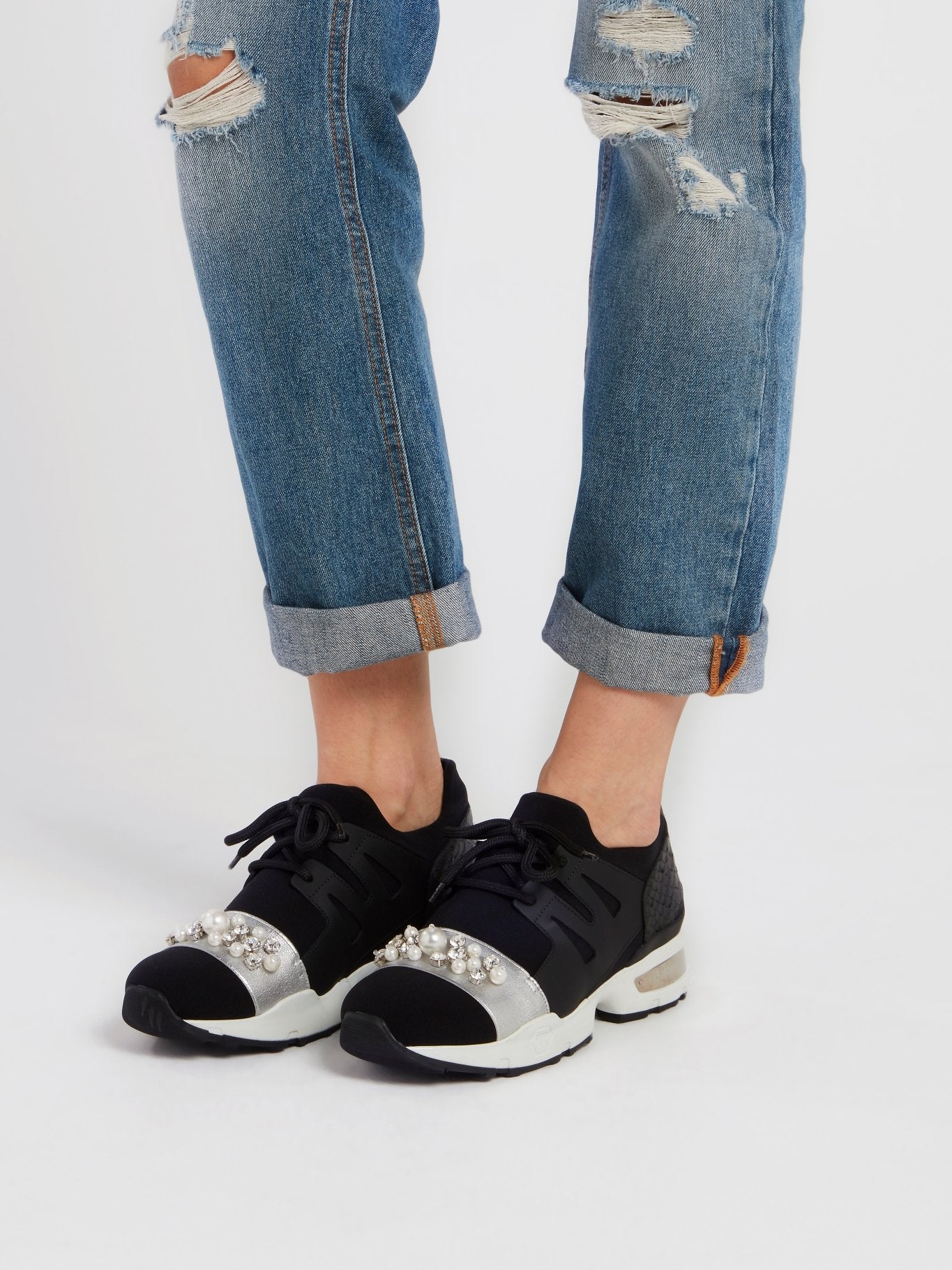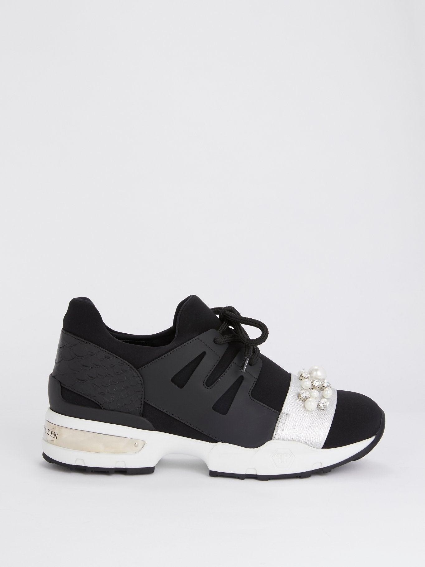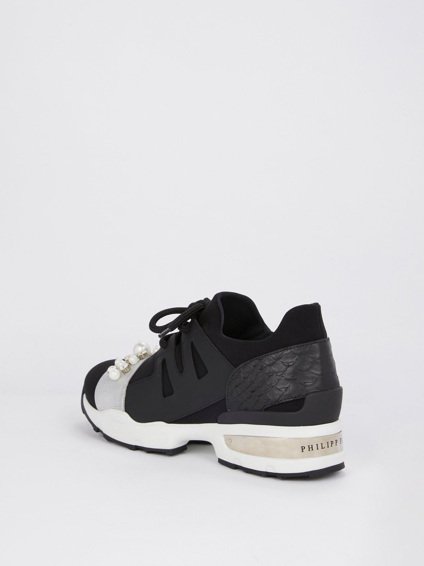 Step up your fashion game with the Black Pearl Embellished Low Top Sneakers from Philipp Plein. These luxurious sneakers feature a sleek black leather design accentuated with stunning pearl embellishments for a glamorous touch. Whether you're running errands or heading out for a night on the town, these sneakers are sure to turn heads and elevate any outfit.
