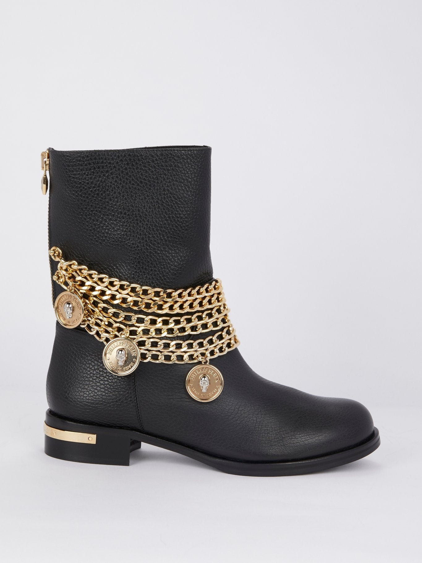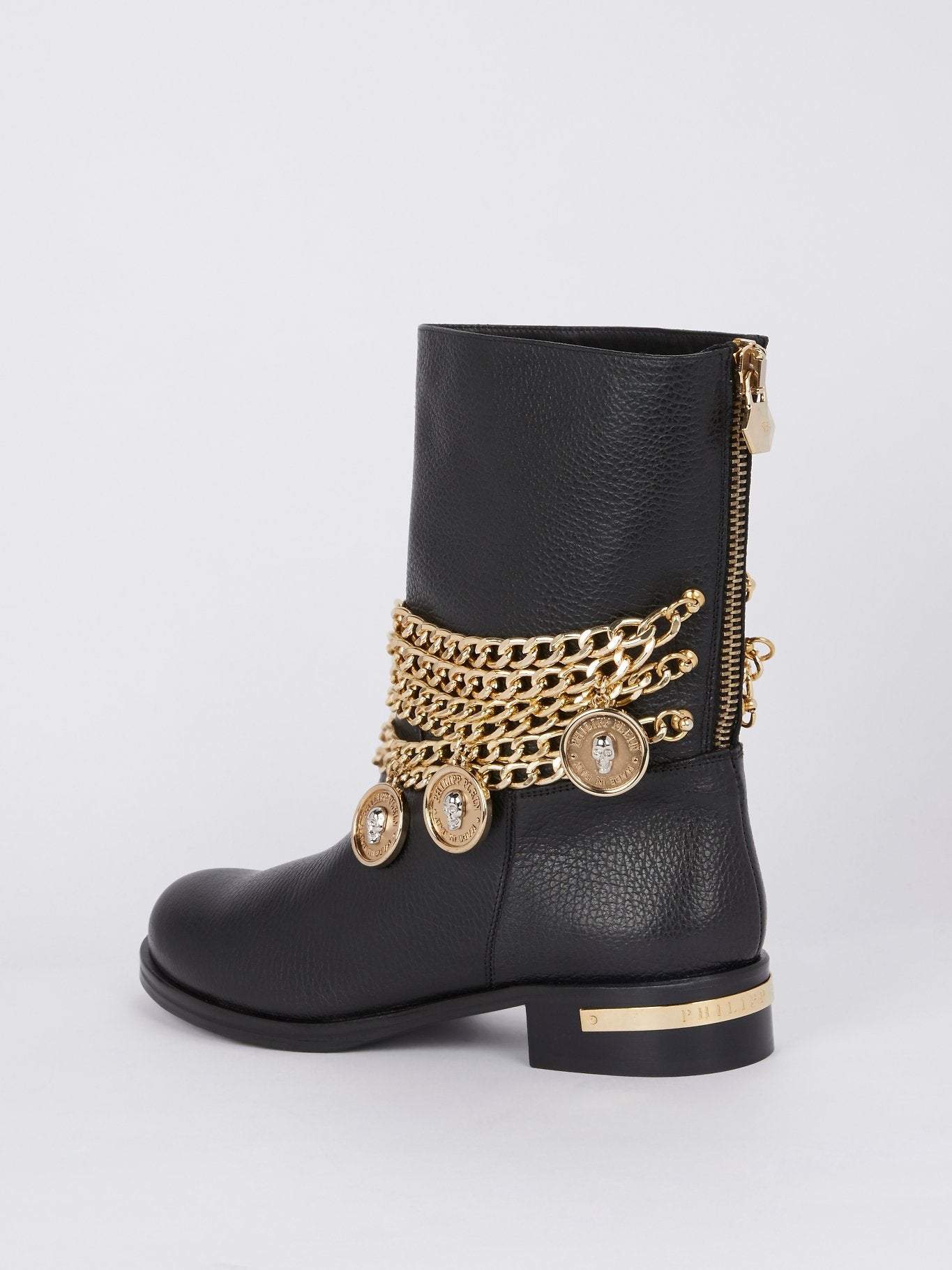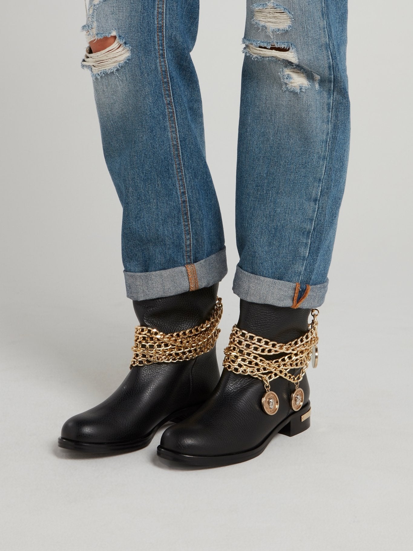 Черные кожаные ботинки с золотыми цепями