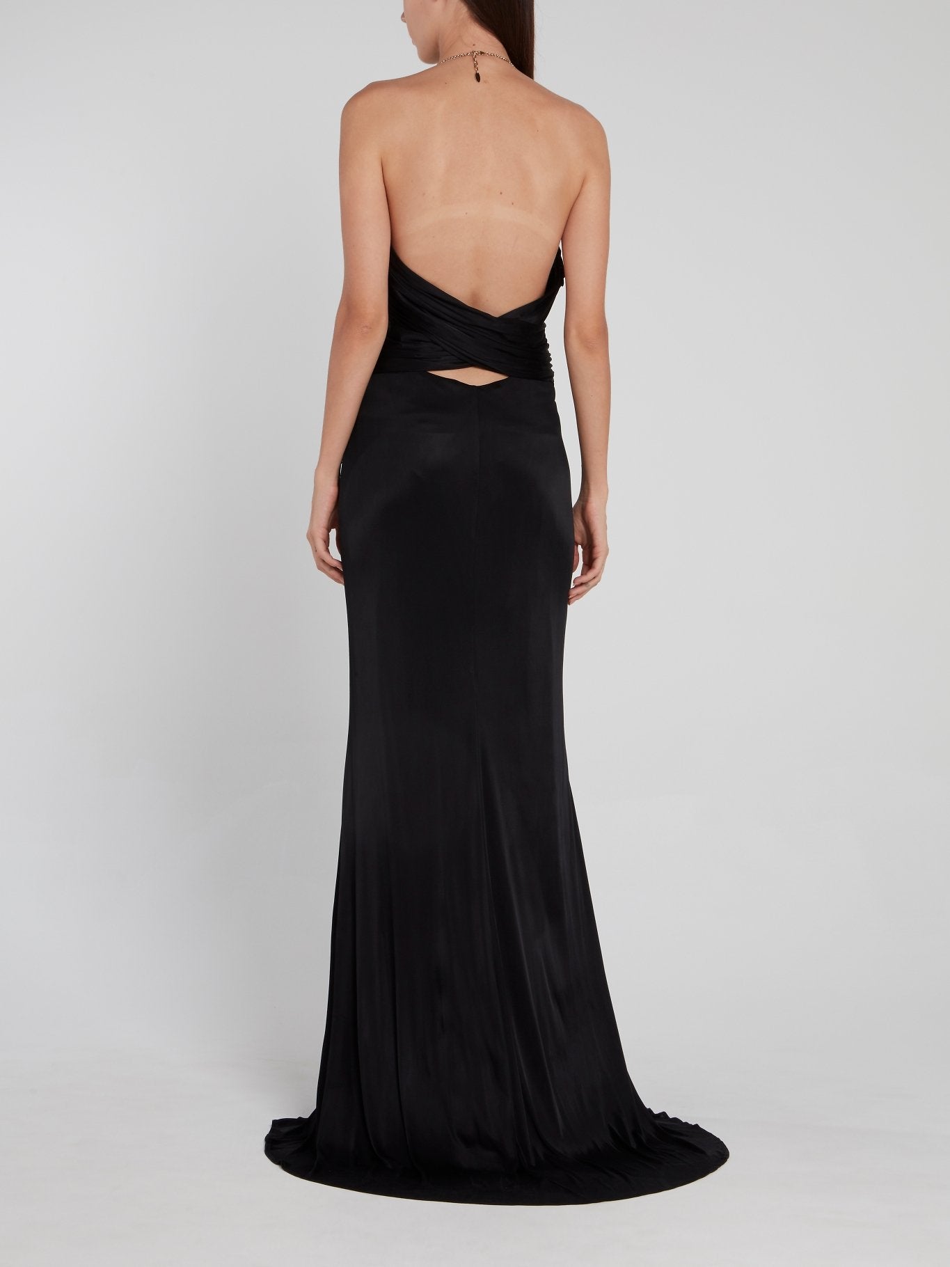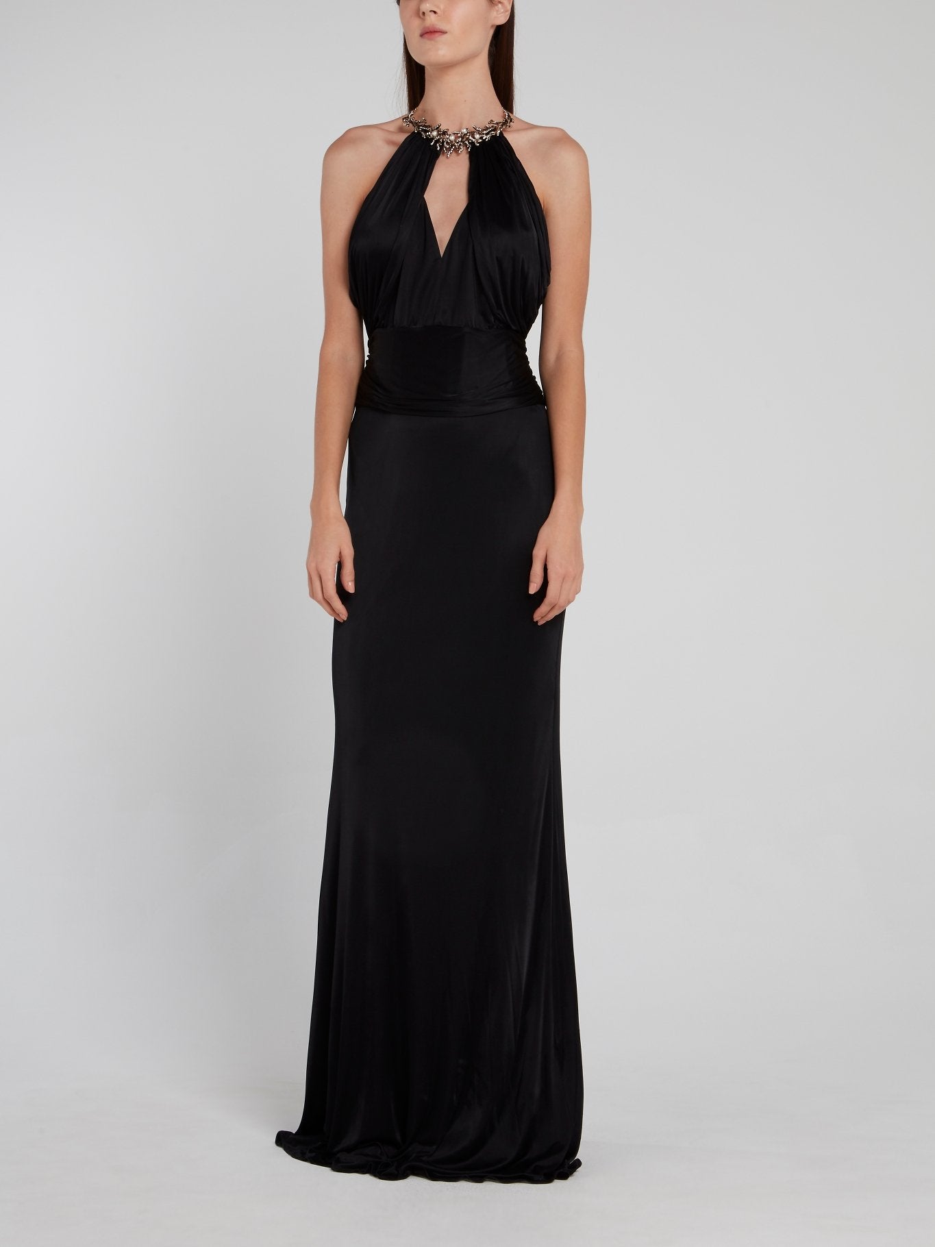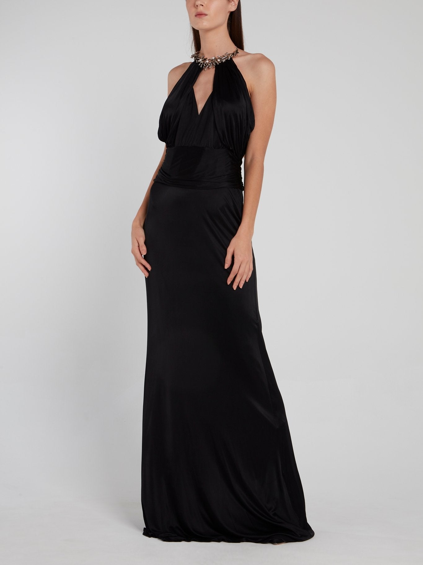 Черное платье с вырезом халтер и отделкой