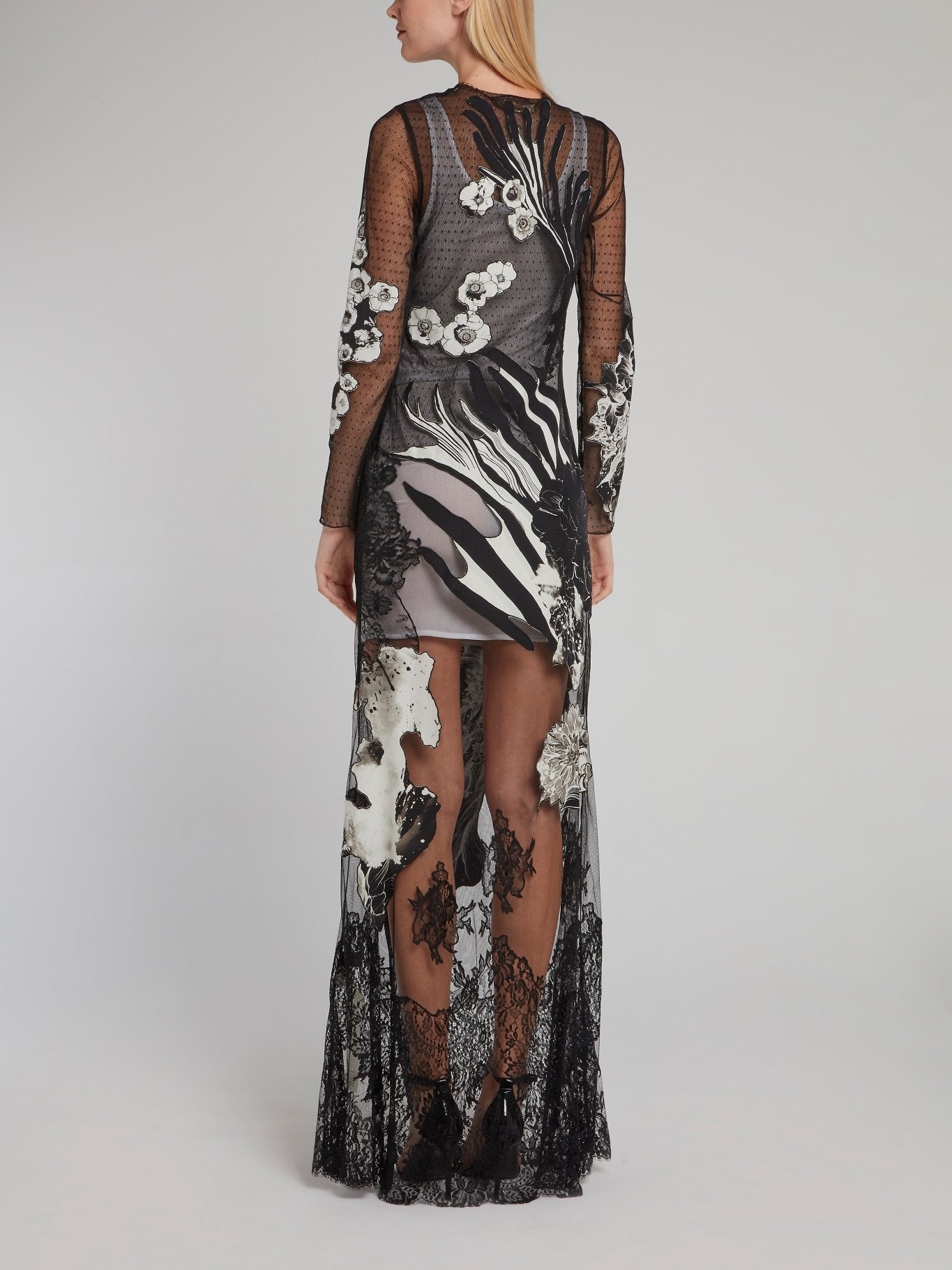 Черное платье-макси с цветочным принтом и прозрачными вставками