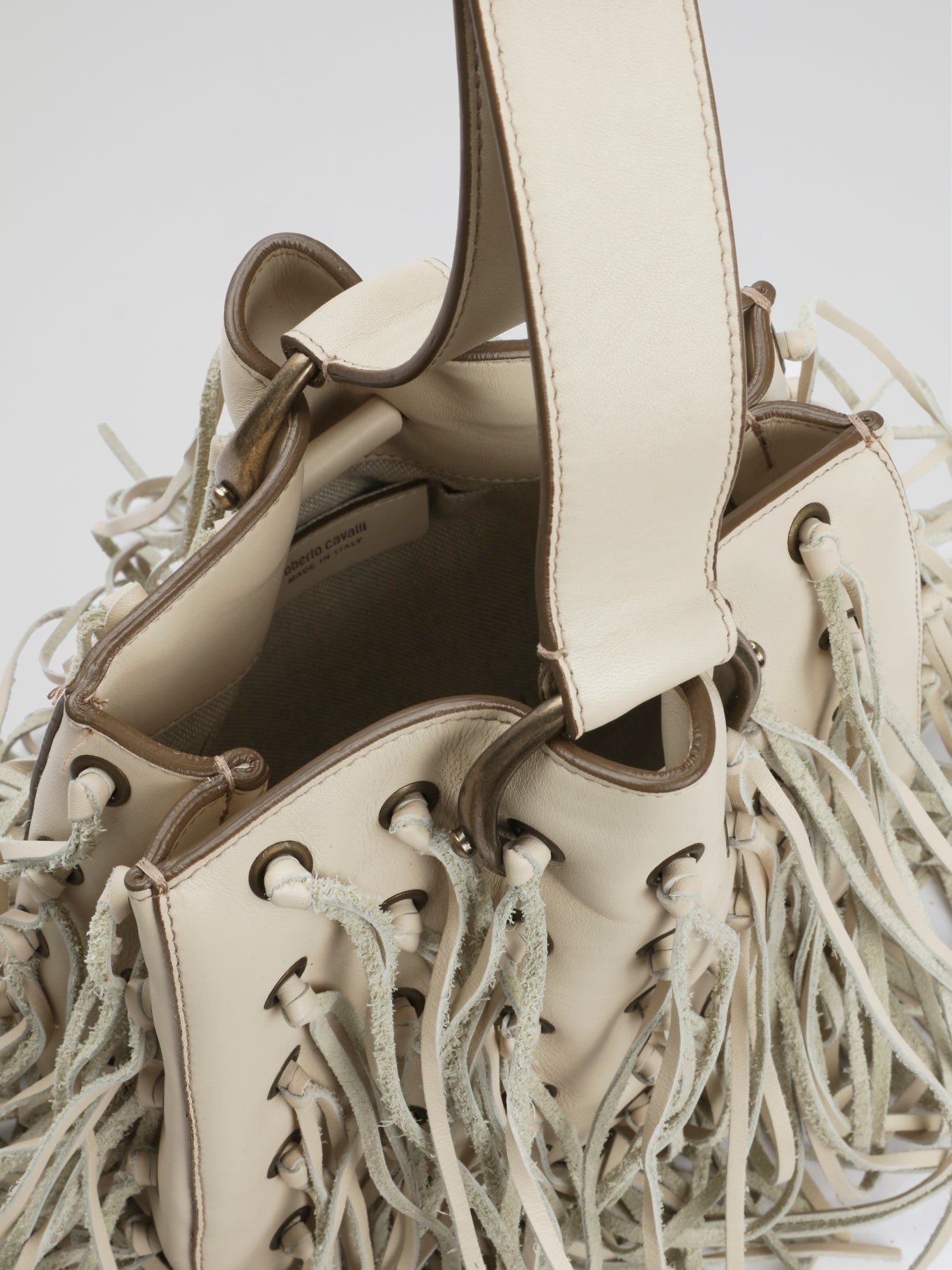 Add boho edge to your look with the White Ivory Fringe Wristlet Bag by Roberto Cavalli. Featuring flowing tassel fringe and a lace-up front design, it’s the perfect mix of playful and chic. Easy to carry with its wide wrist strap, this statement piece is ready for festivals, nights out, or everyday flair.