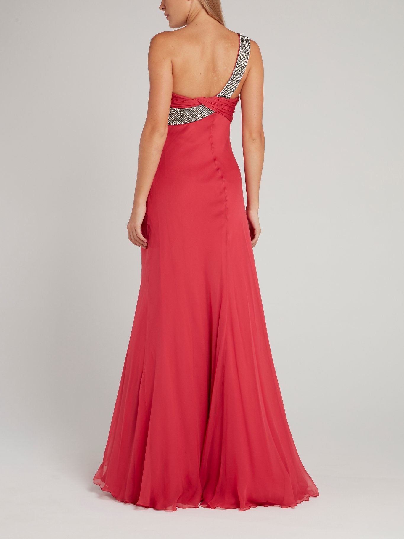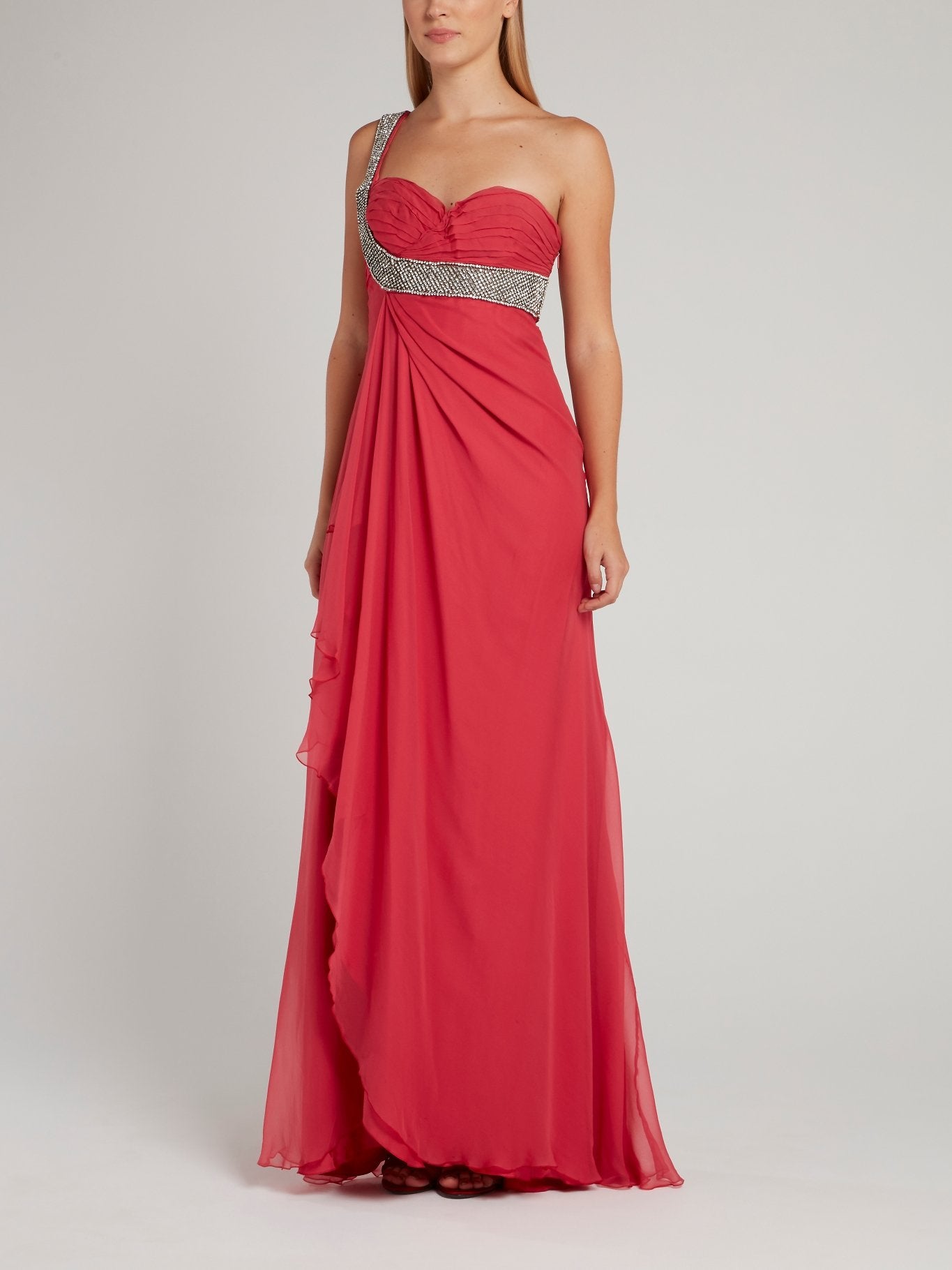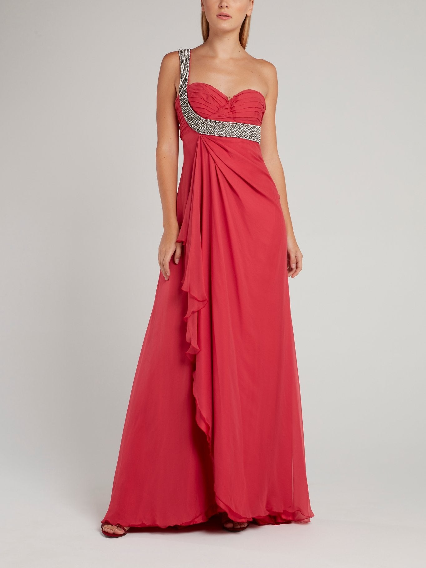 This evening gown by Roberto Cavalli captures timeless romanticism and is a magnificent choice for your next special event. Designed for a curve-hugging fit in flowing fabric, the dress falls from a single shoulder strap to a charming draped finale, caressing the contours of the body on its approach. Seal the ensemble with a clutch that complements the dress's embellishments.