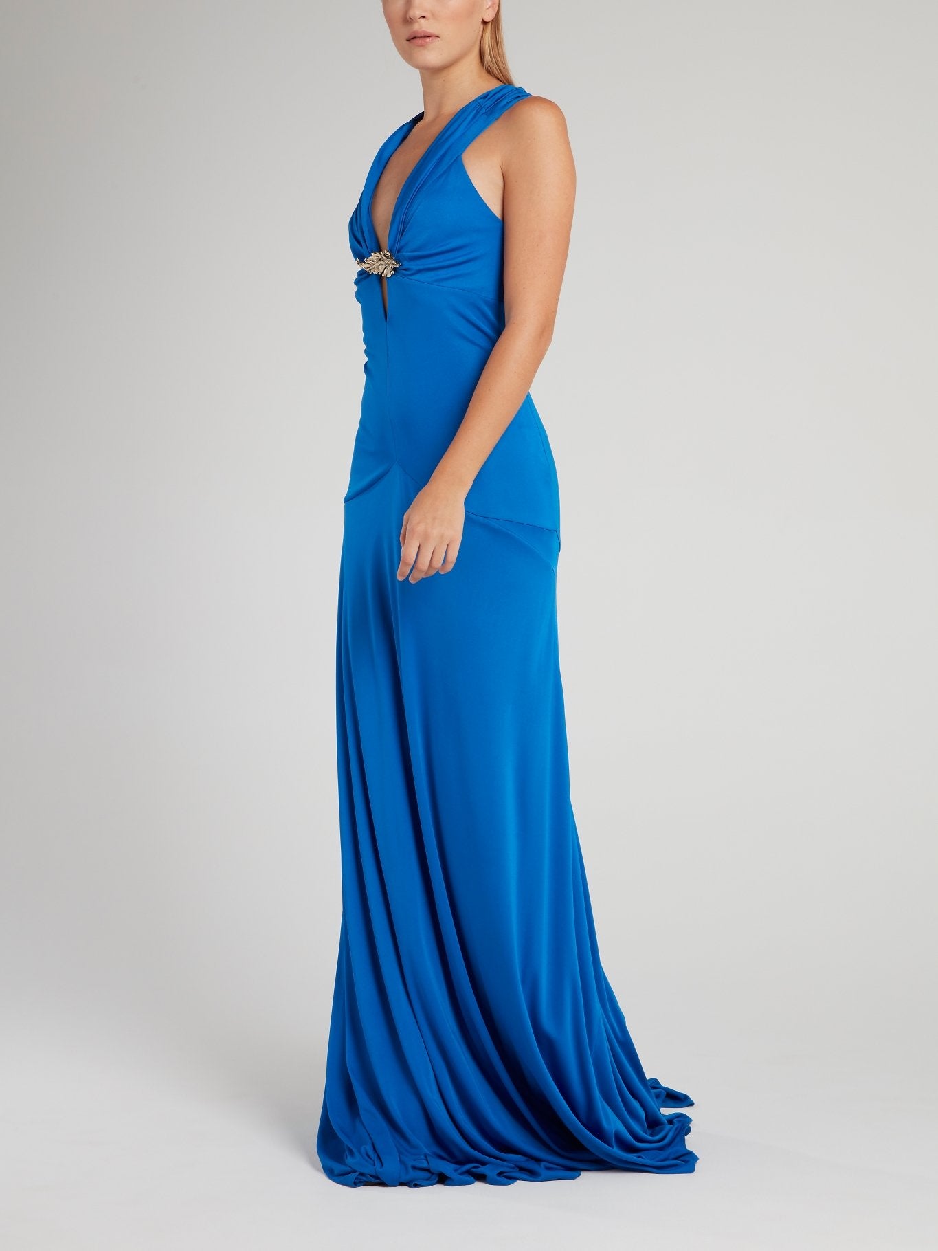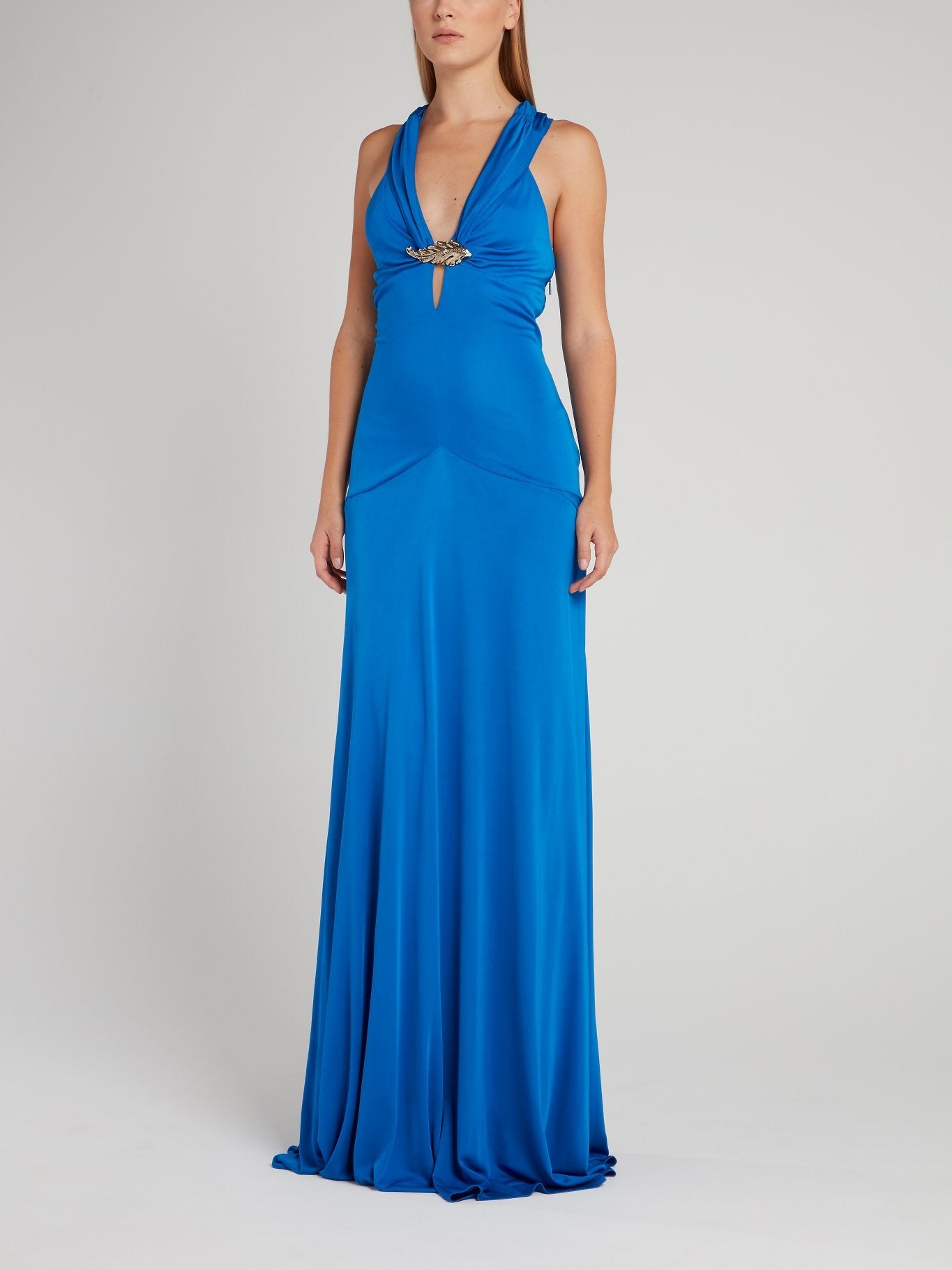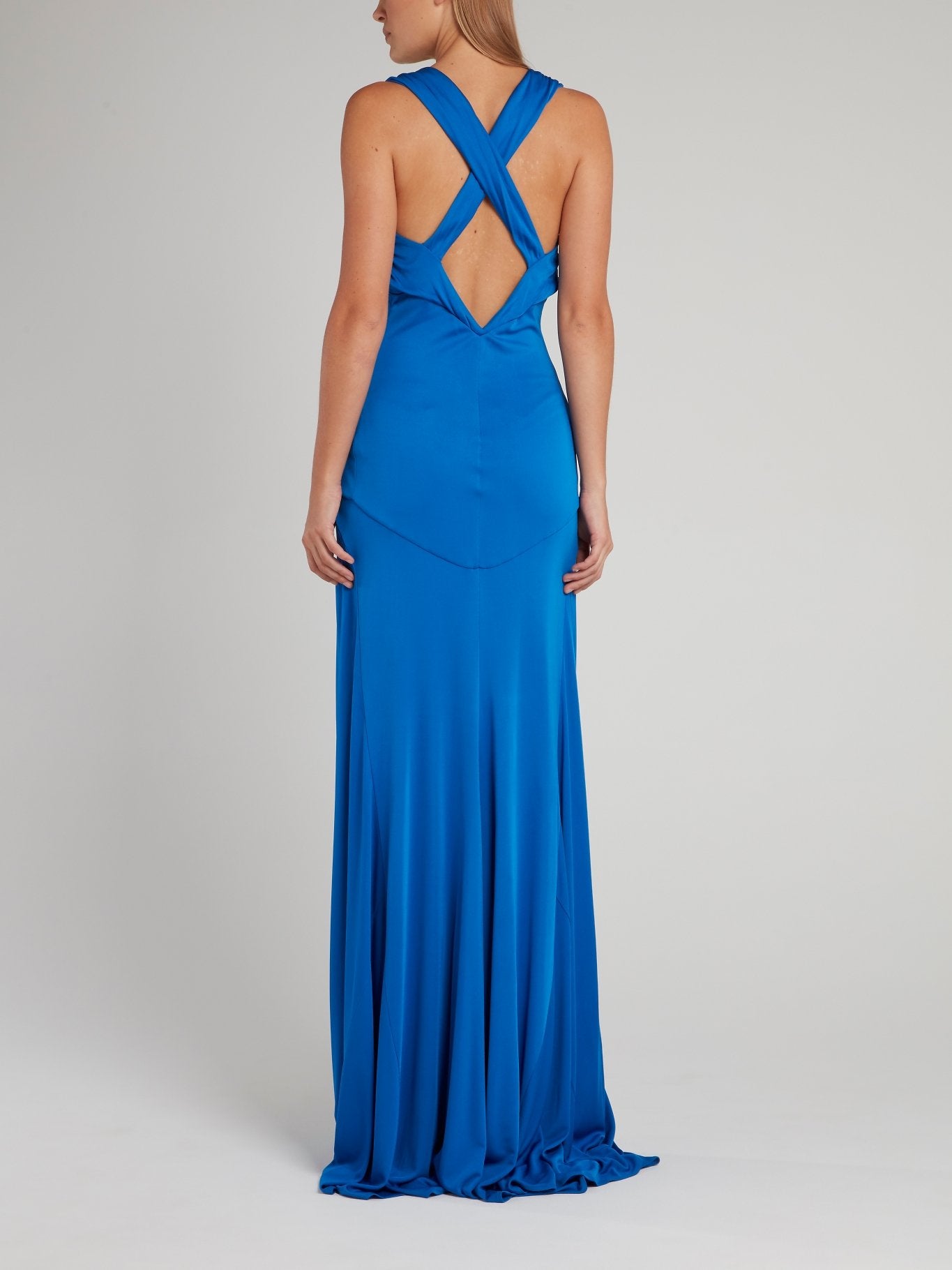 Синее платье-макси с глубоким вырезом и бретельками крест-накрест на спине