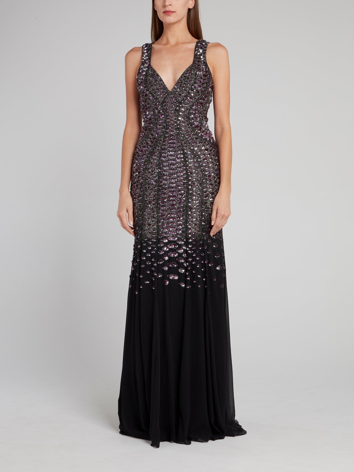 This Roberto Cavalli's charismatically embellished maxi dress evokes a sophisticated reptilian aesthetics. Its statuesque silhouette is defined by tonal scalloped embroidery defining a plunging neckline, rear cut-out details, and an elegant floor-sweeping skirt. Complement the look with a casual chignon with your hair and accessorize with gold-tone hoop earrings.