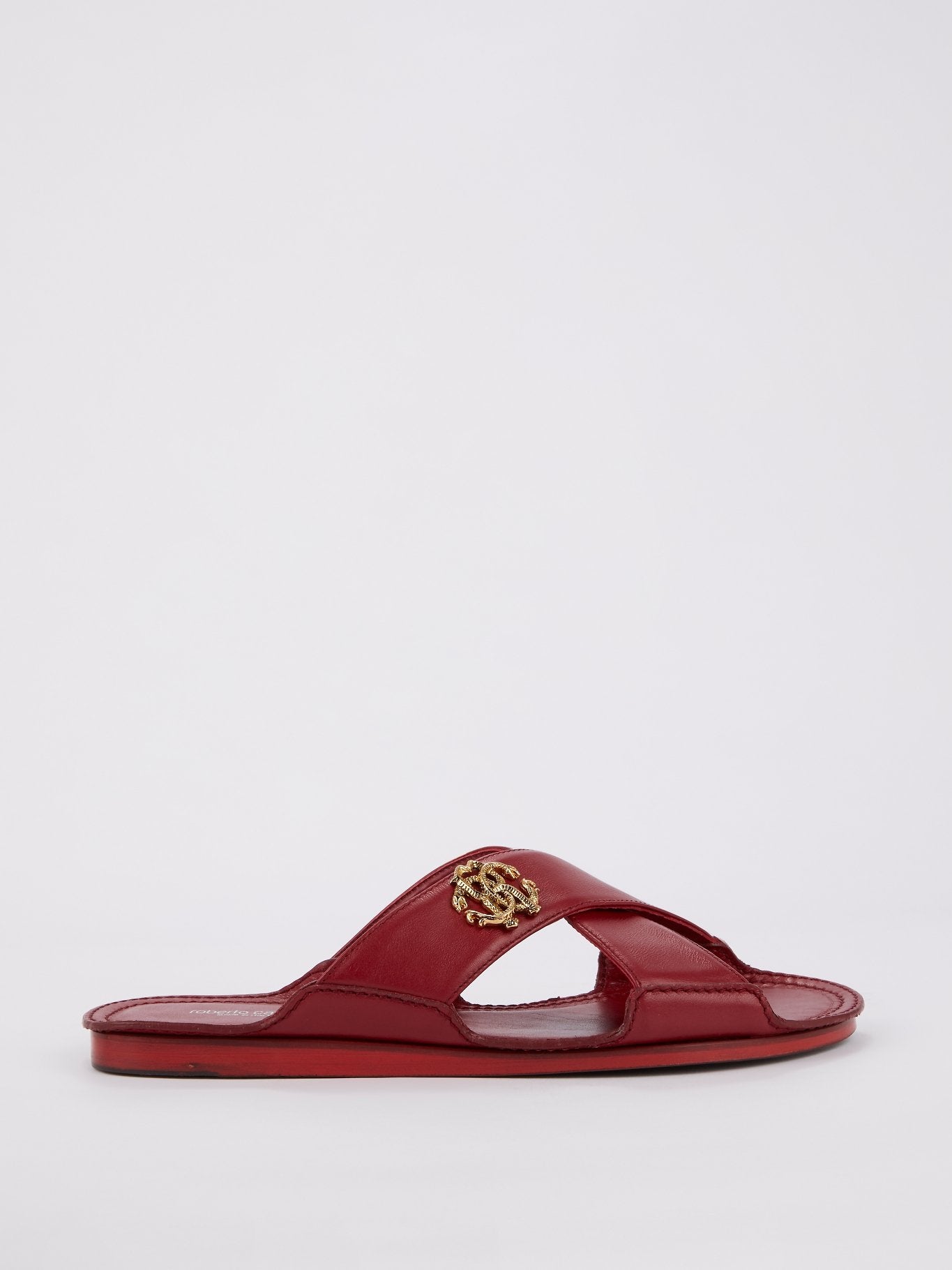 Красные шлепанцы с ремешками крест-накрест и монограммой